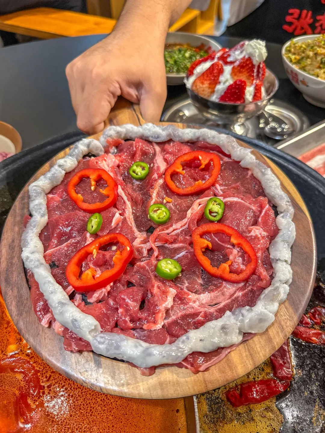 很有趣的创意。鲜切牛肉片上铺着一层滑嫩的虾滑,下锅几秒就熟,口感香嫩爆汁,肉食爱好者会很喜欢。