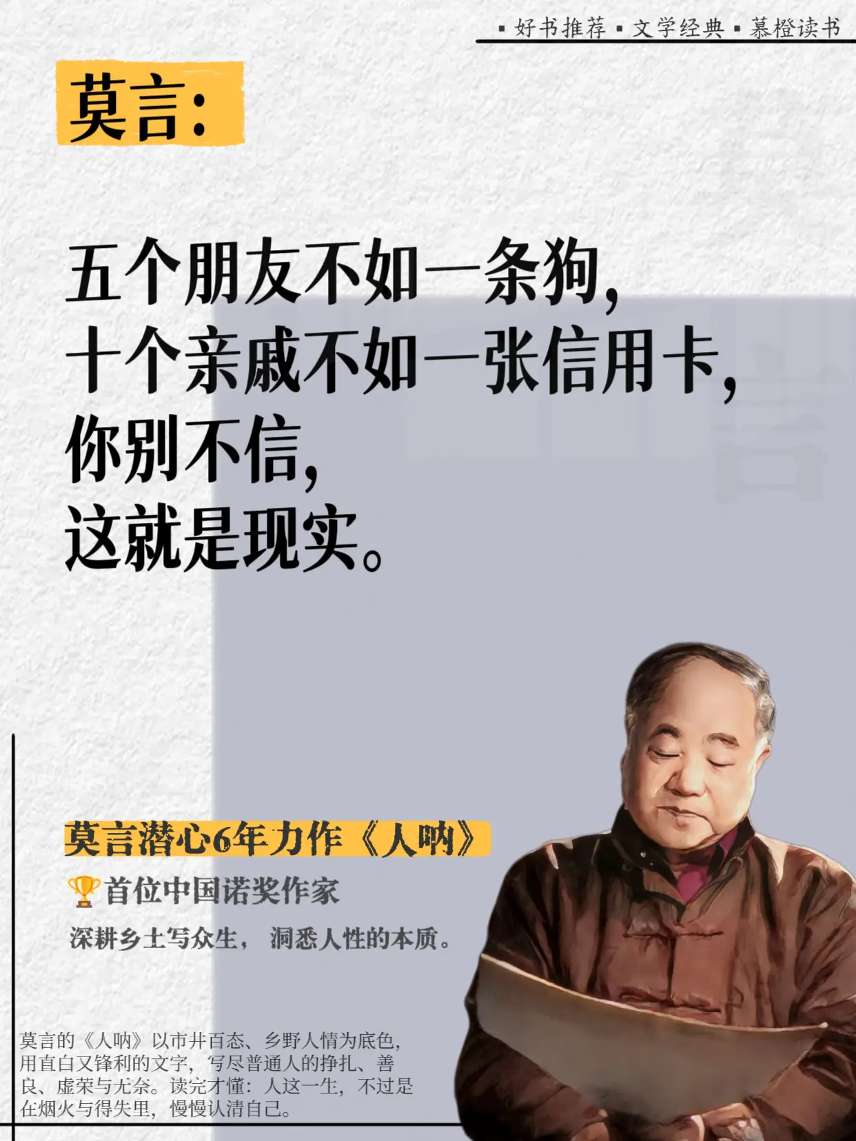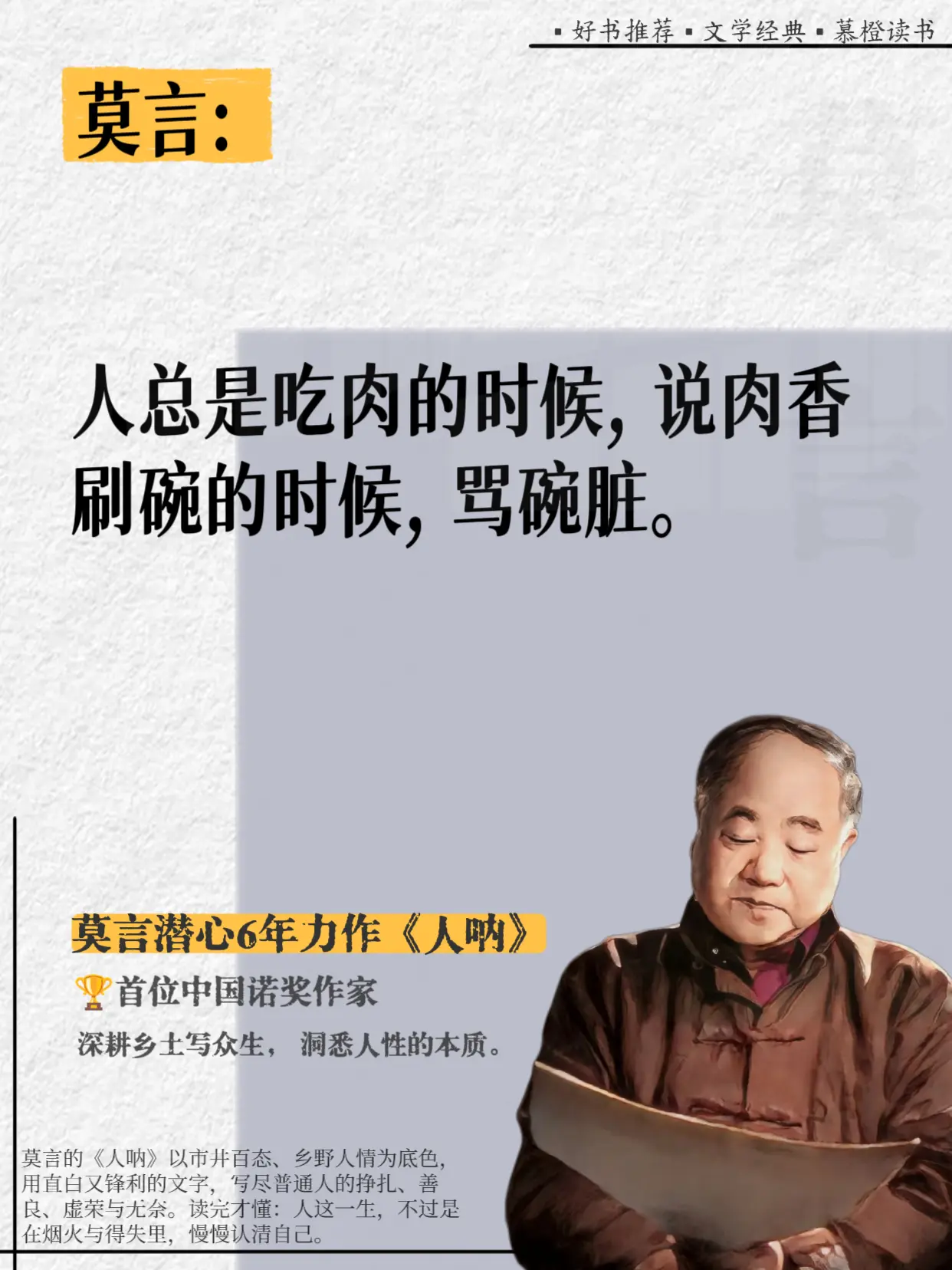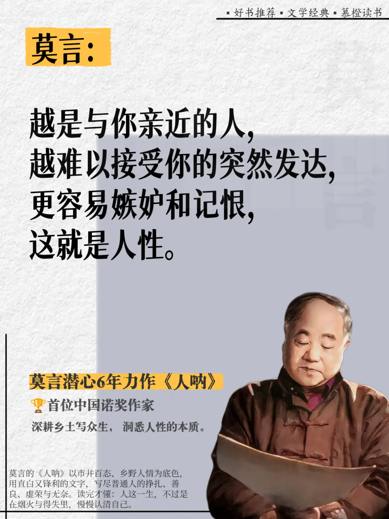 好敢说啊,莫言完全戳破了人性的虚伪!真的被莫言这段话点醒了!他在《人呐...