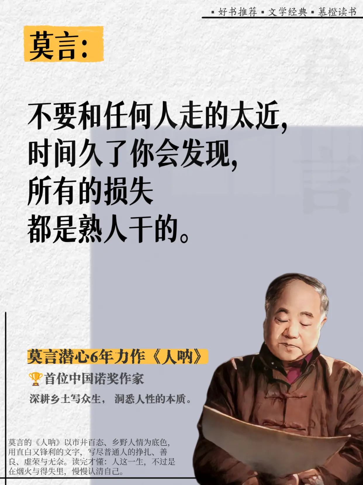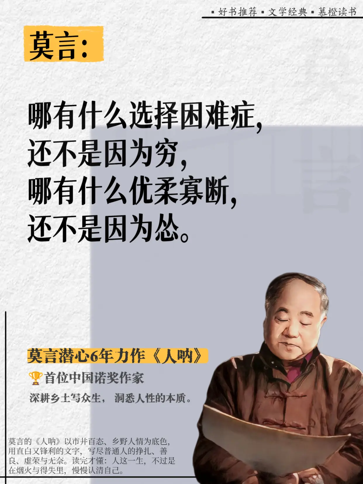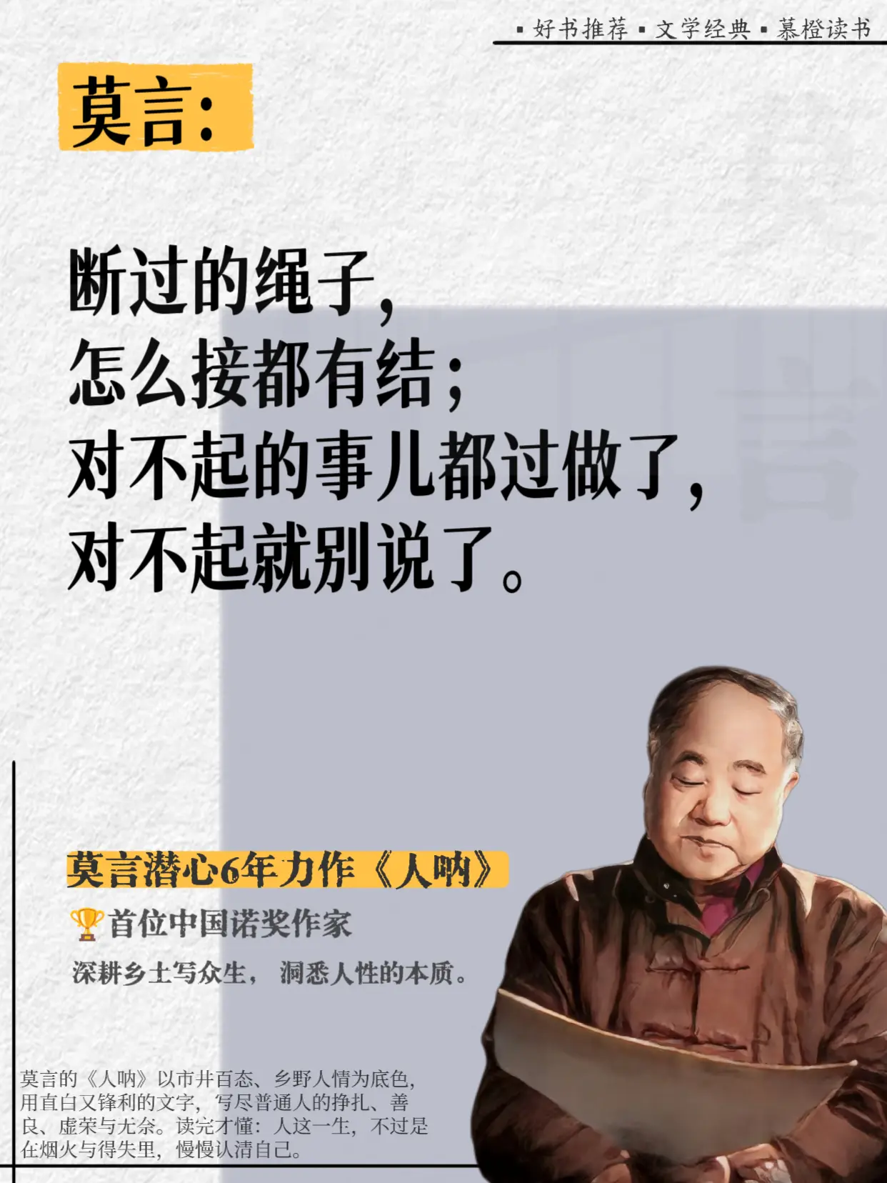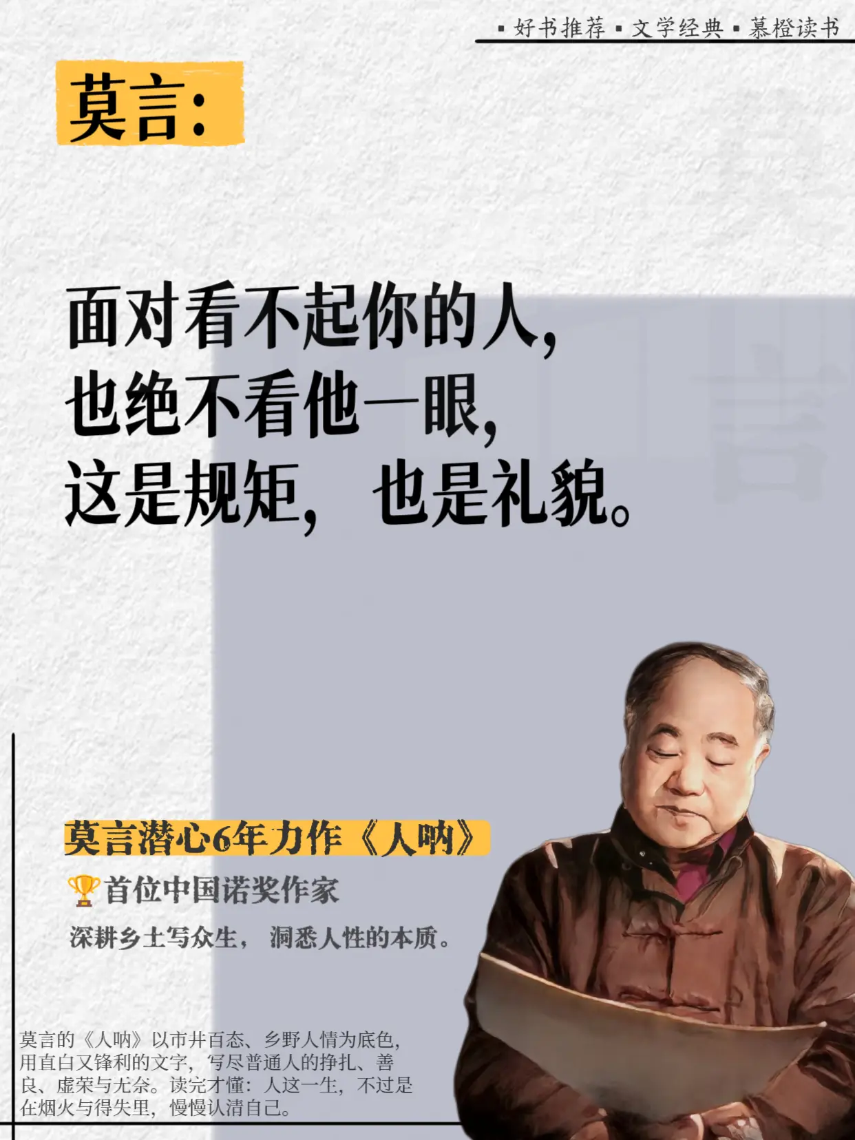 好敢说啊,莫言完全戳破了人性的虚伪!真的被莫言这段话点醒了!他在《人呐...