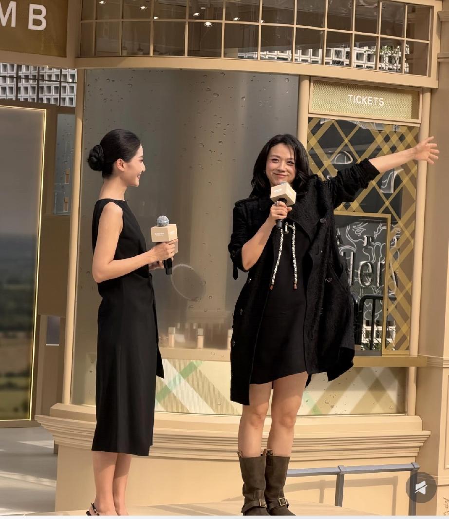 汤唯明显比女主持人穿的厚,她的小腹是隆起的,她坐下时用双手托着肚子。