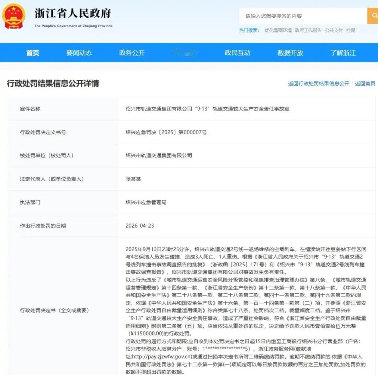 最近,浙江省政府官网挂出了一张罚单,去年震惊全网的绍兴地铁“9·13”撞人事故终于有了处罚结果。绍兴市轨道交通集团有限公司被罚款115万元。这不仅是官方对事故的最终认定,更是用真金白银给所有企业敲响安全警钟。