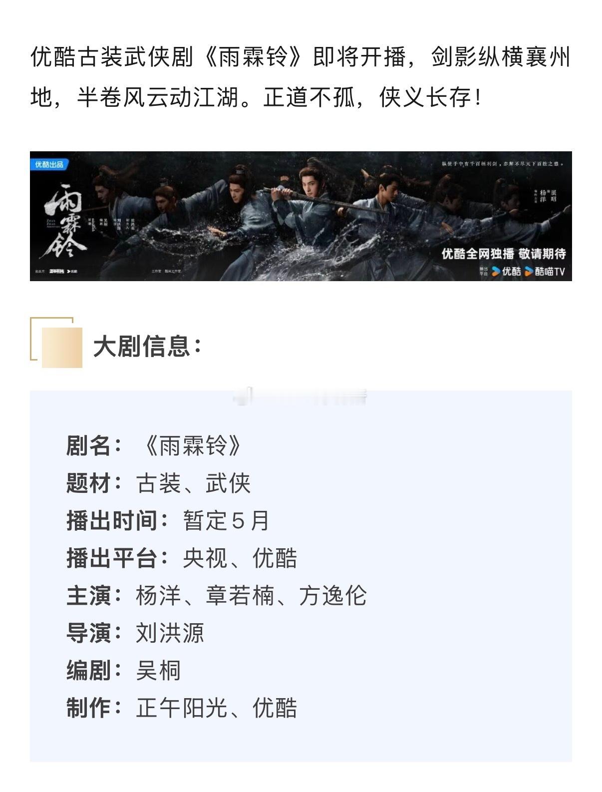 杨洋 章若楠《雨霖铃》再次开启招商,5月播出高能剧情+天选展昭+顶配主创
