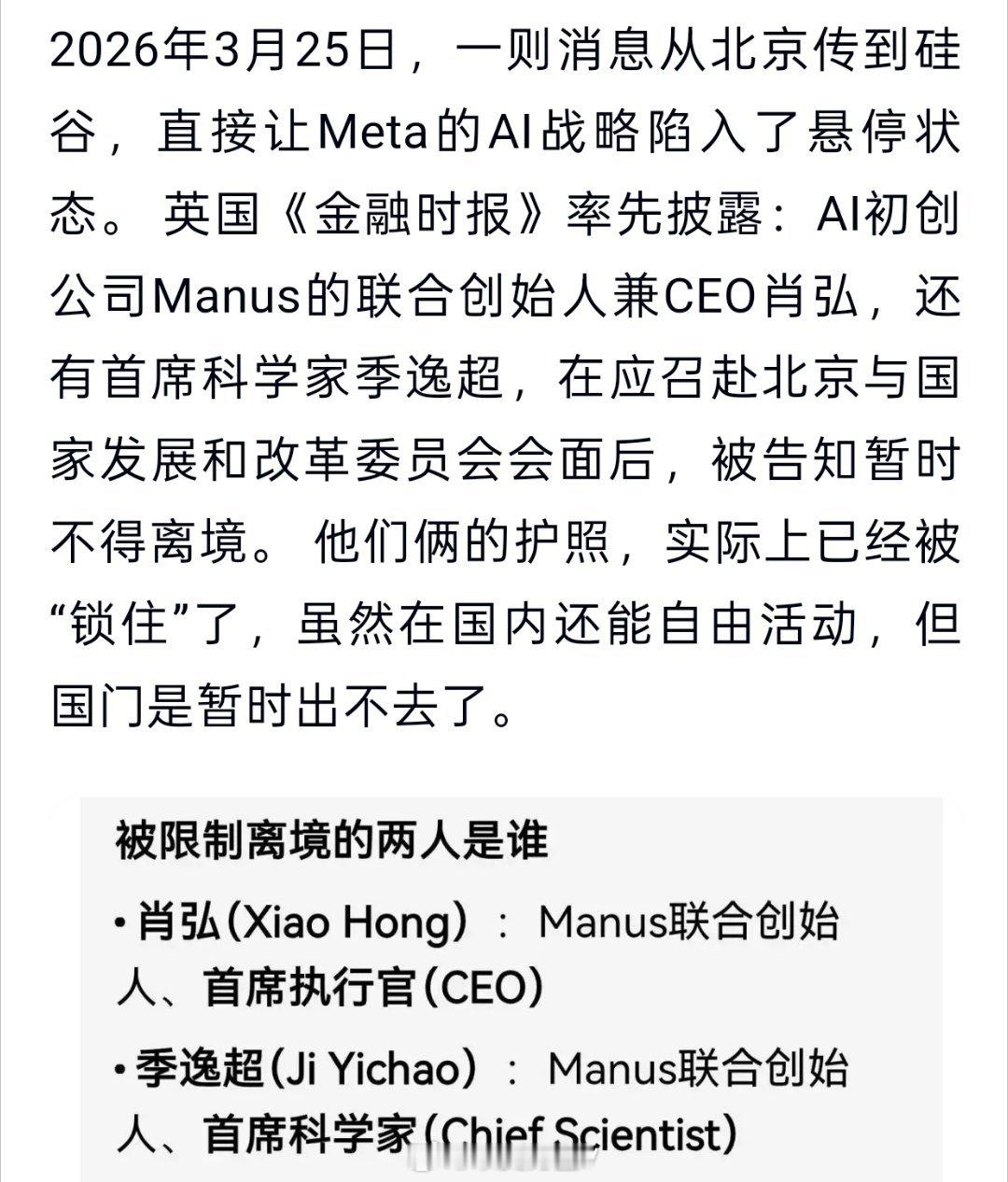 在国家大势上看不清方向,只能说自己做的决定自己负责吧!Meta Manus热点观点