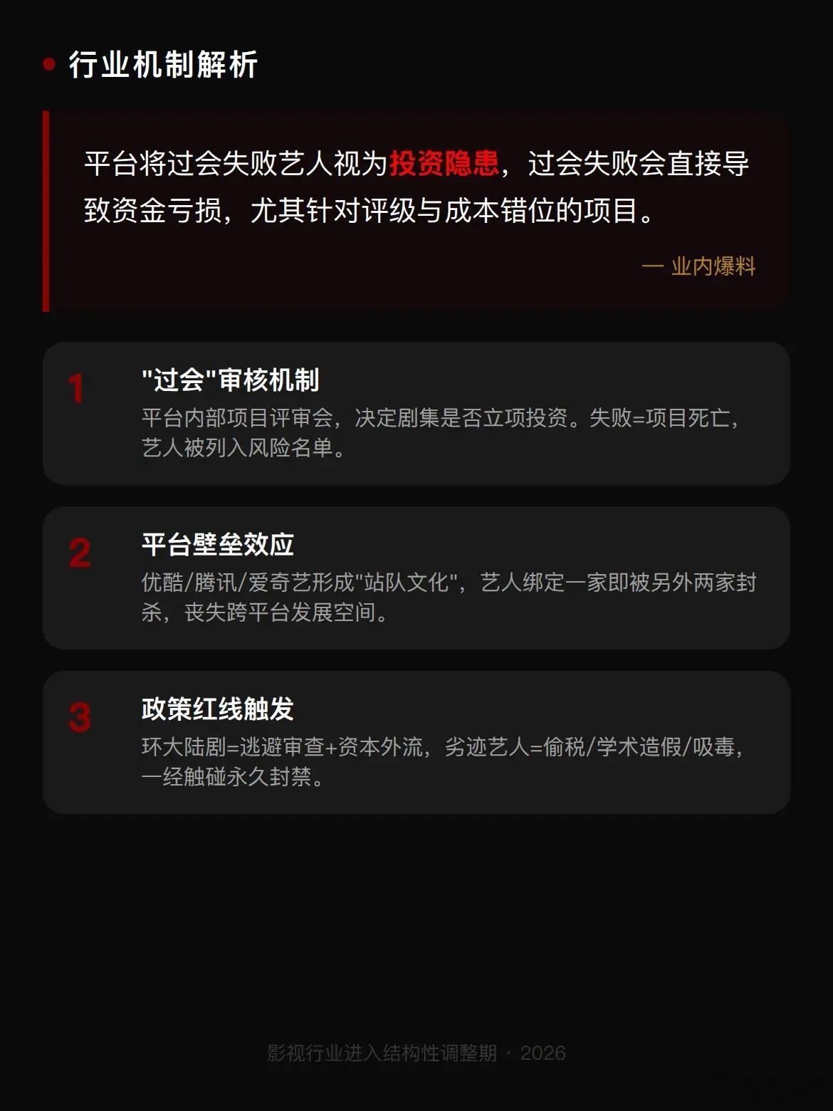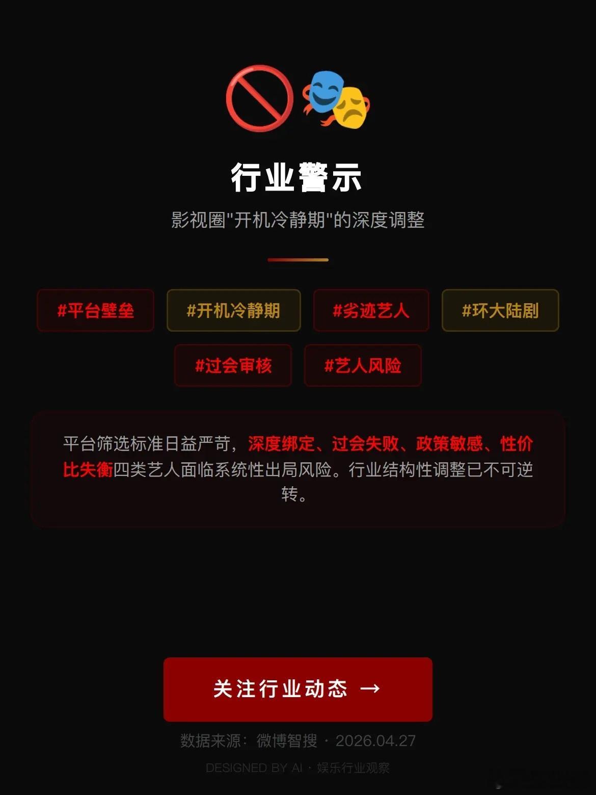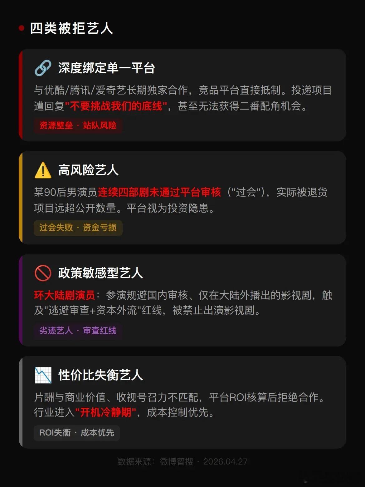 平台明确不要的艺人所谓“平台明确弃用艺人”,并不是指有对外公布的固定名单,而是在2026年内娱项目普遍进入开机冷静期的大环境下,那些过会风险偏大、商业性价比严重不符预期,或是触碰行业合规红线的艺人,被各大平台纳入内部风控、直接不予启用的一类群体。