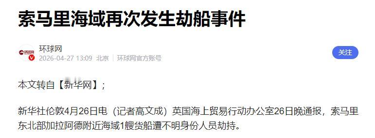 4月26日,英国那边一艘货船在索马里东北部一个叫加拉阿德的地方附近,被一帮不明身份的人给拿下了。