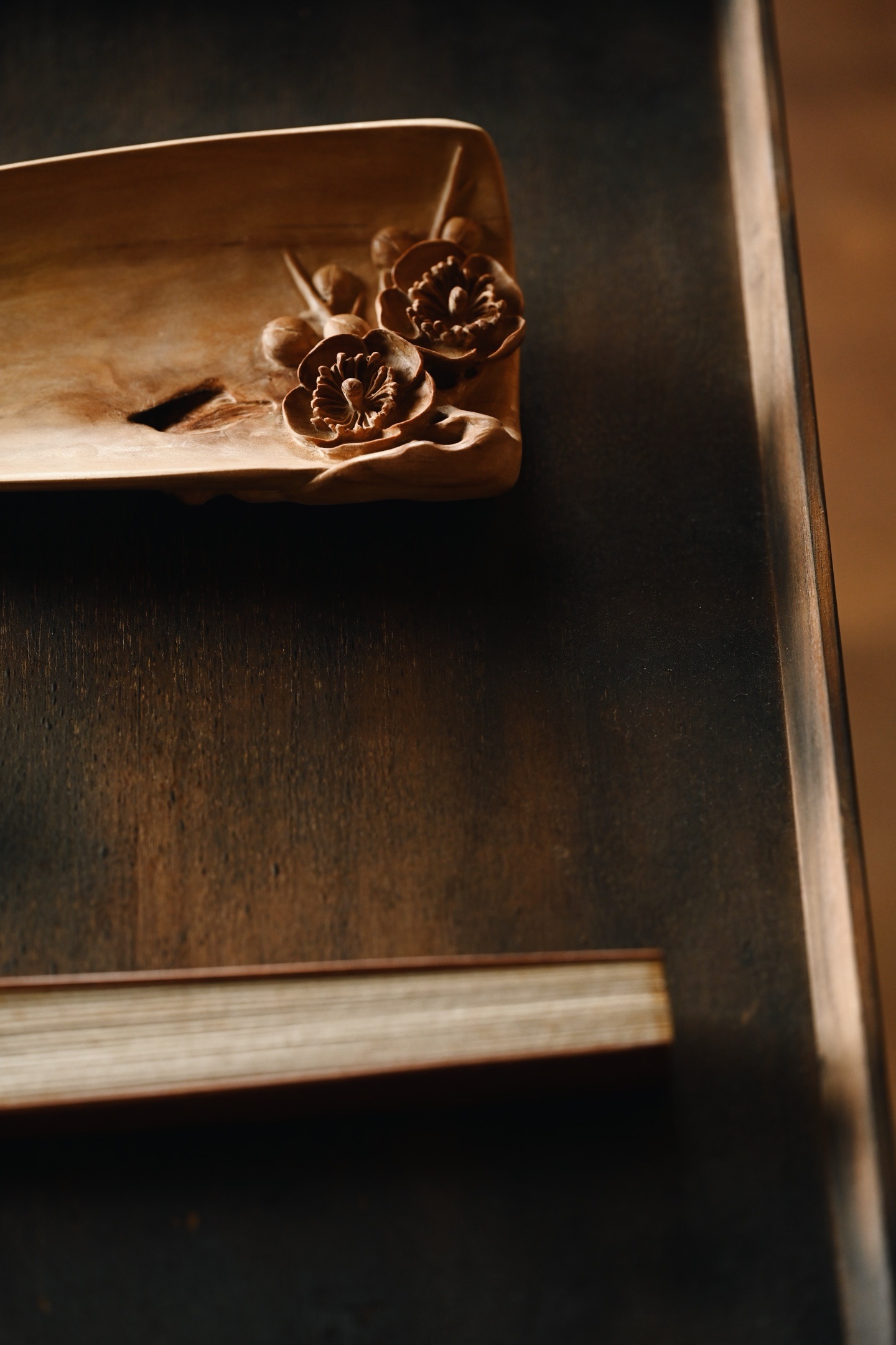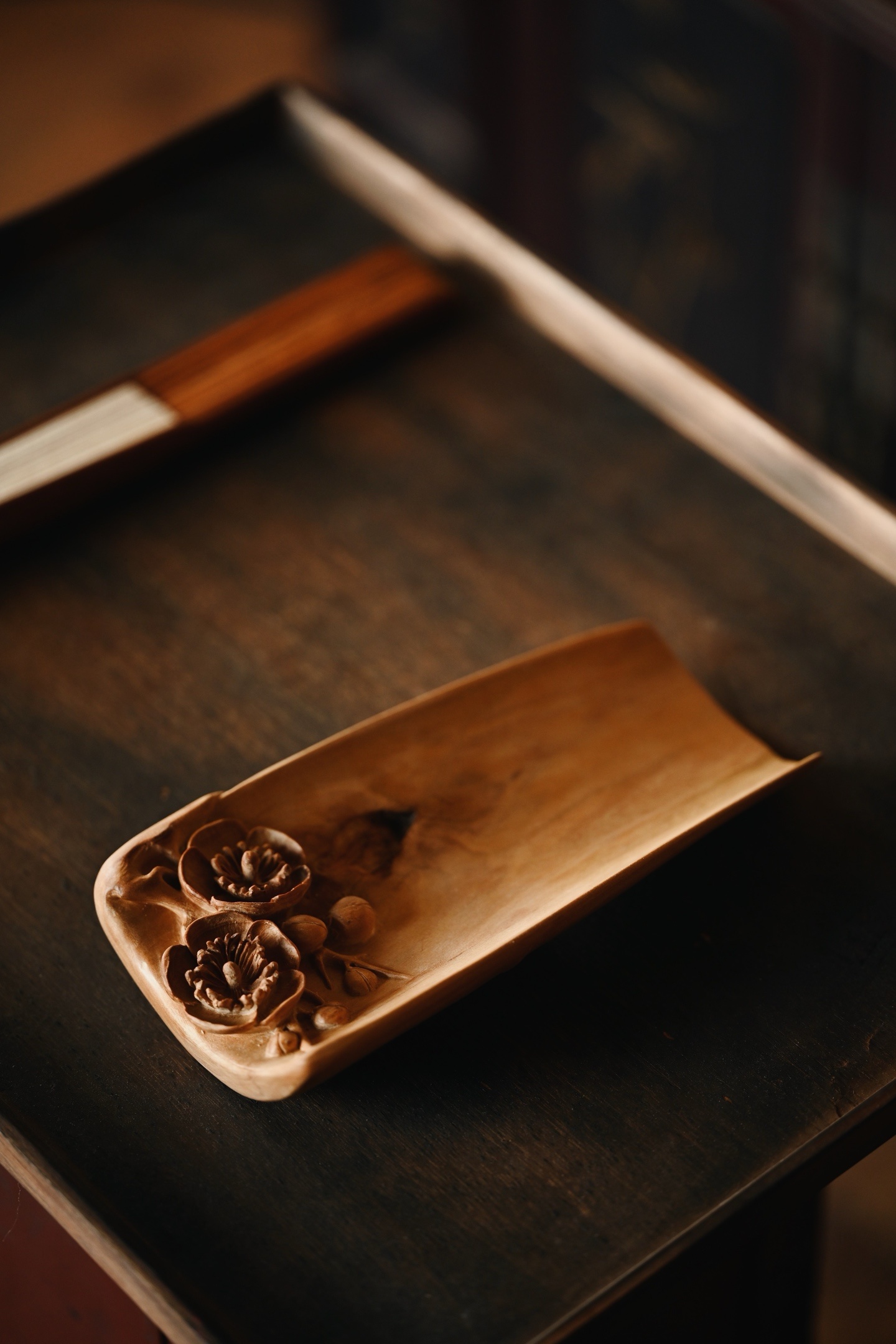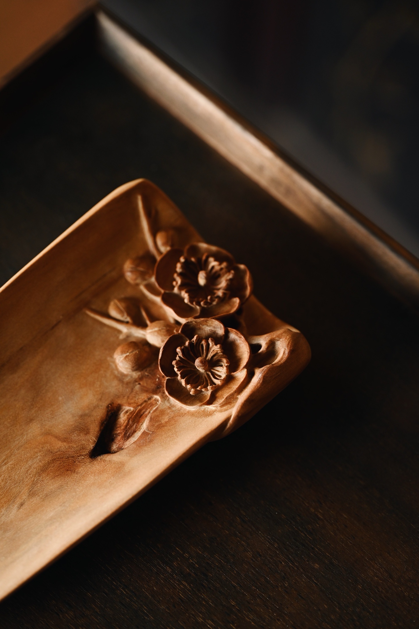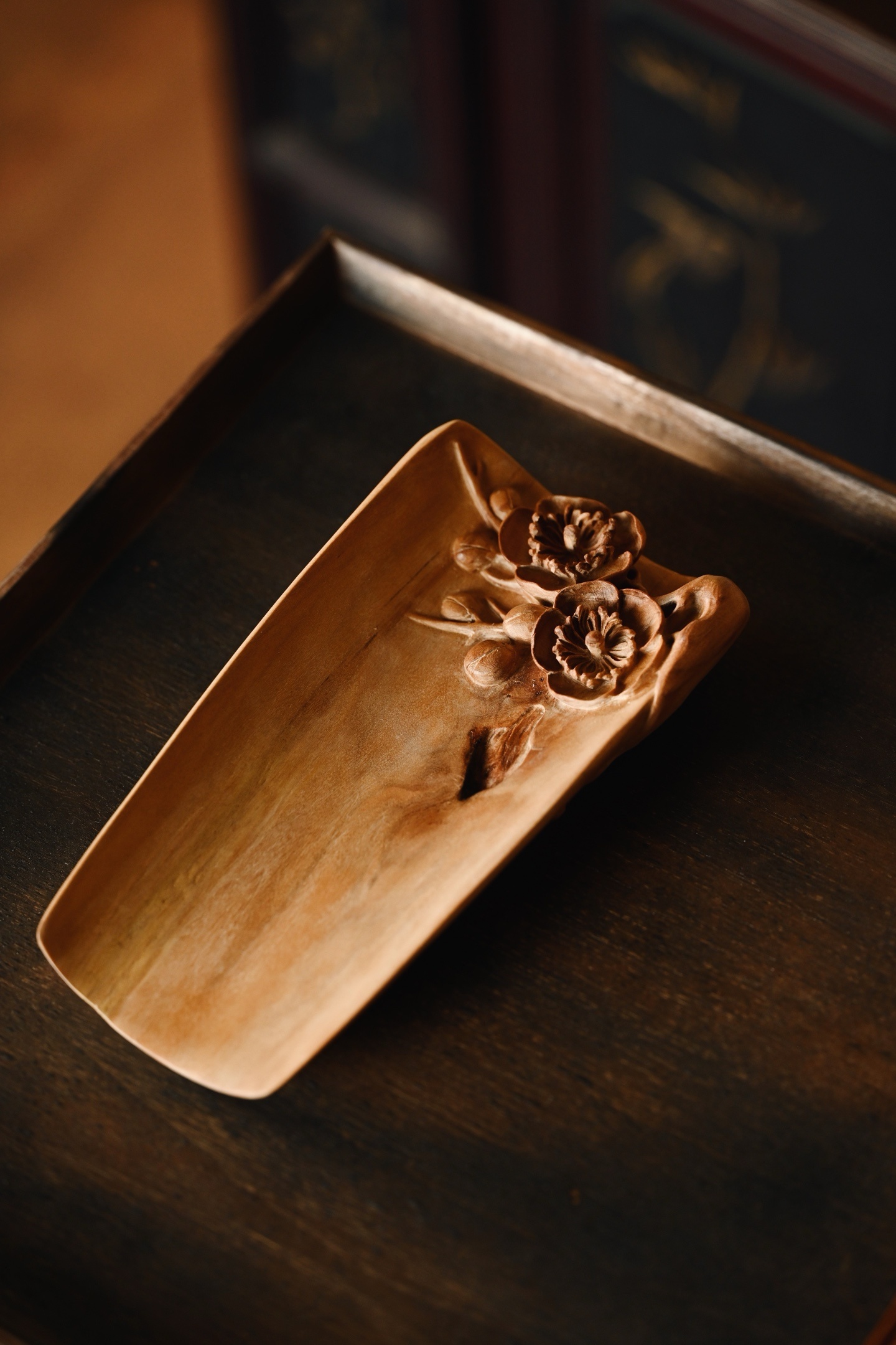 随形而制,雕琢寒梅一枝,花开两朵,瓣瓣分明,枝桠舒展,花苞待放,意趣盎然。简素中见工巧,清寂中藏风骨,持之取茶,观梅品茗,于一器间,尽得文人茶事之雅趣。