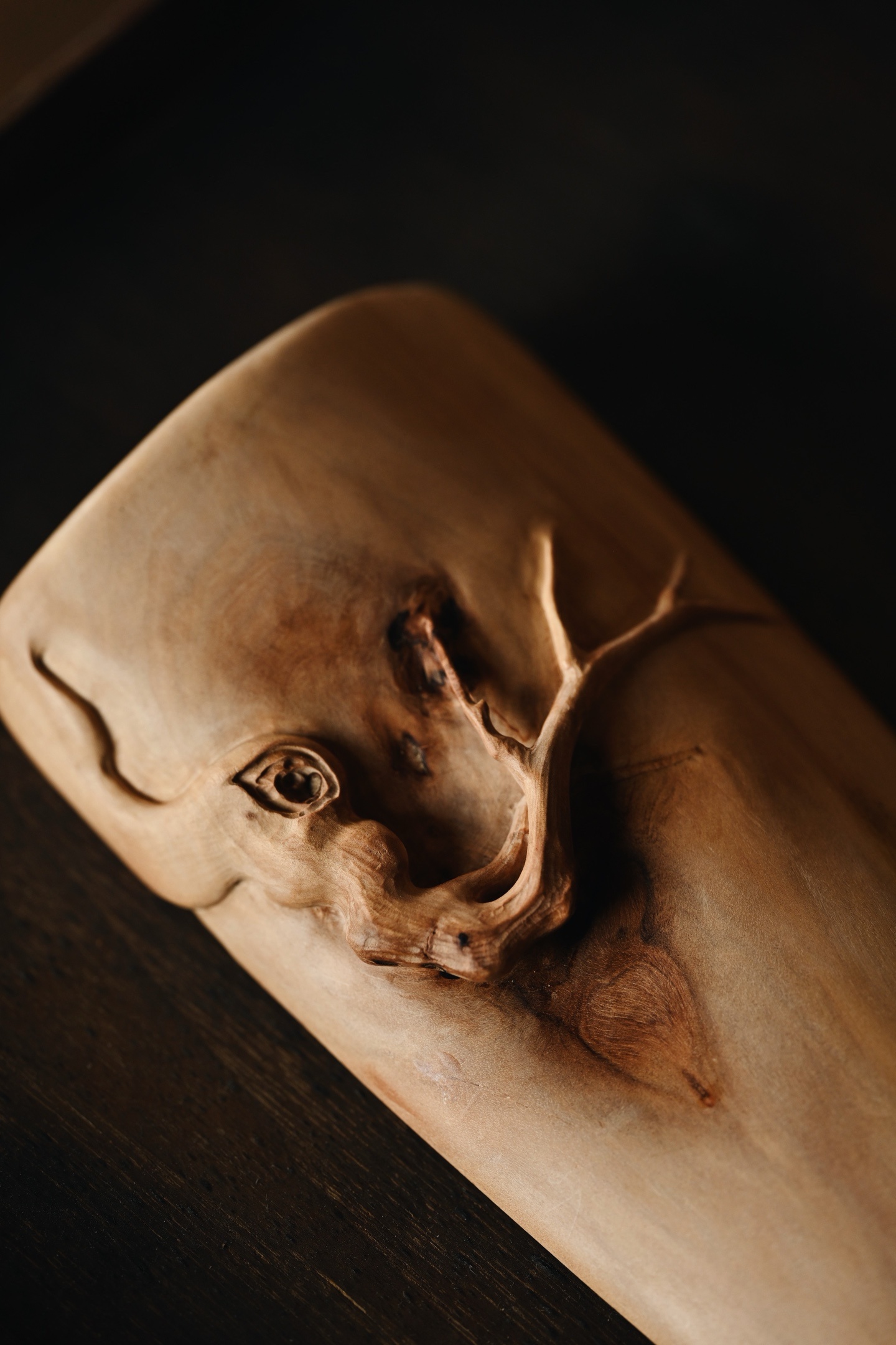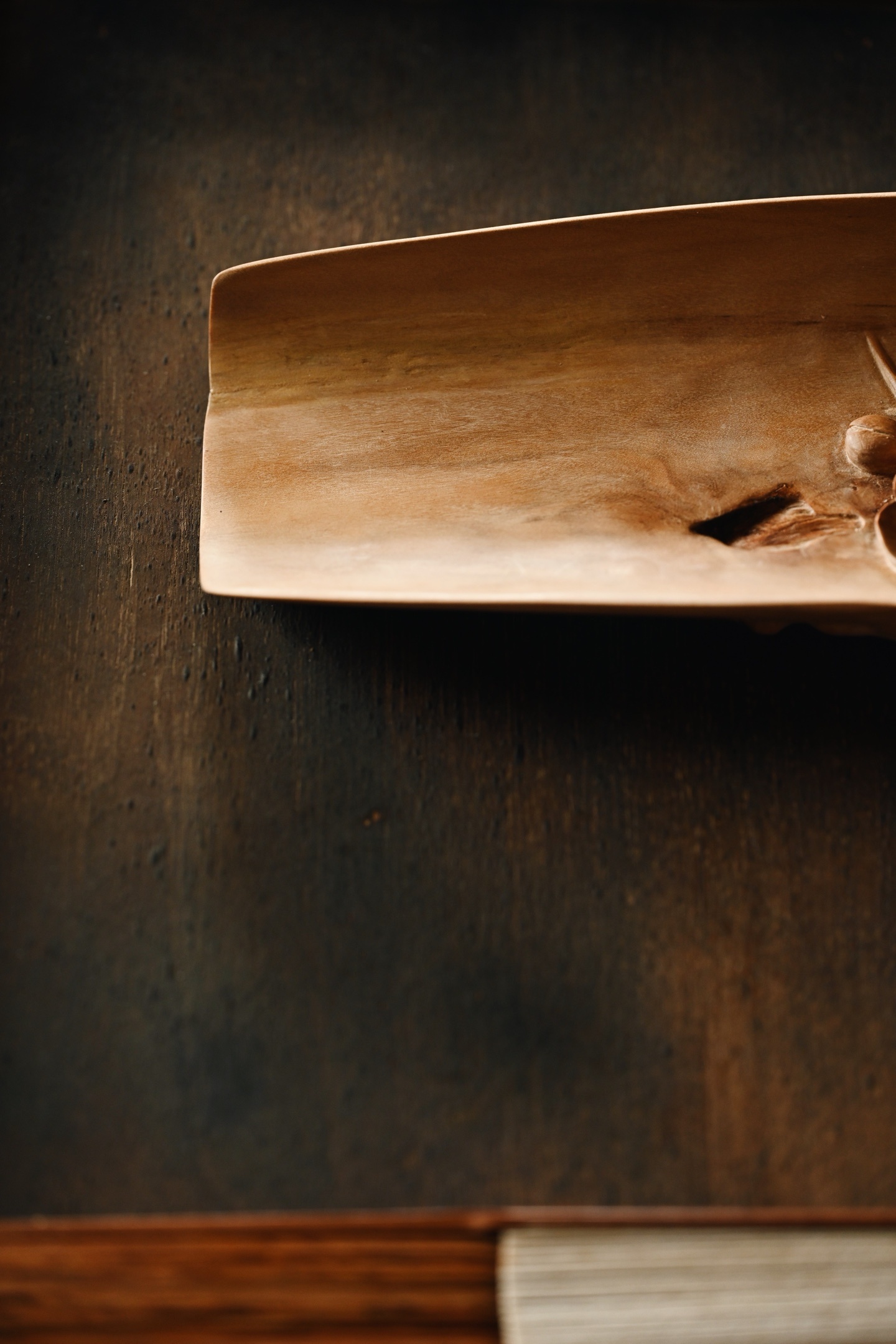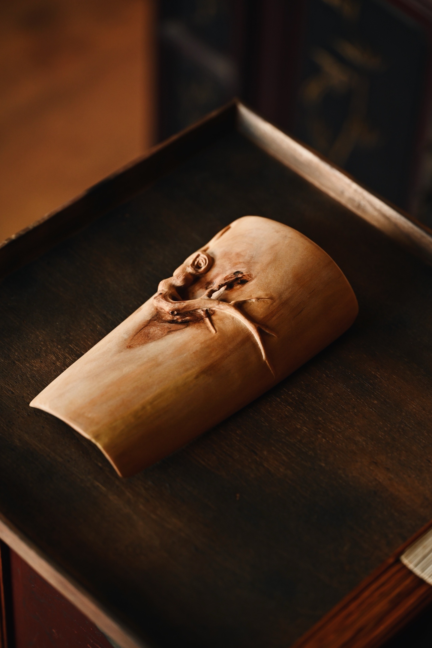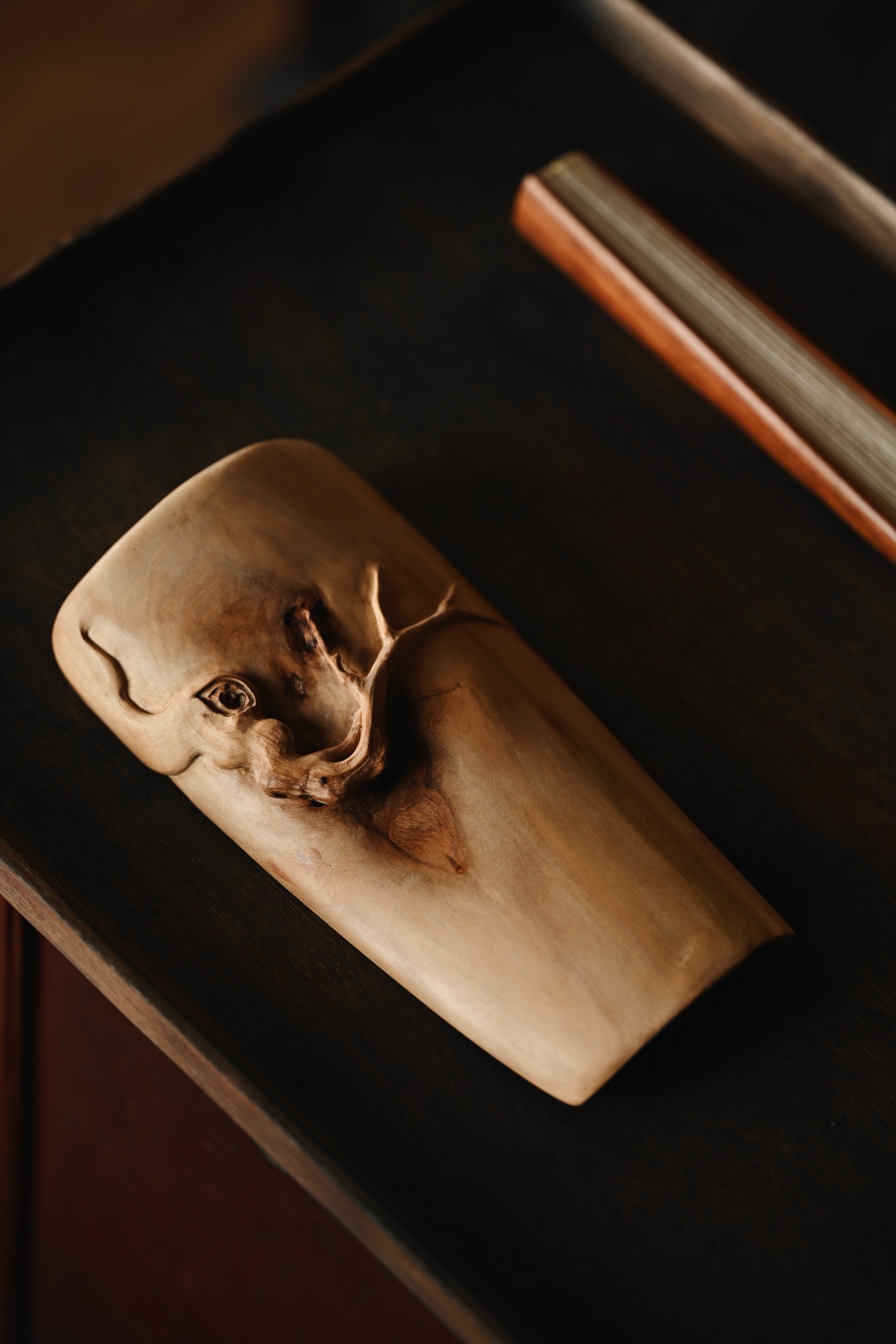 随形而制,雕琢寒梅一枝,花开两朵,瓣瓣分明,枝桠舒展,花苞待放,意趣盎然。简素中见工巧,清寂中藏风骨,持之取茶,观梅品茗,于一器间,尽得文人茶事之雅趣。
