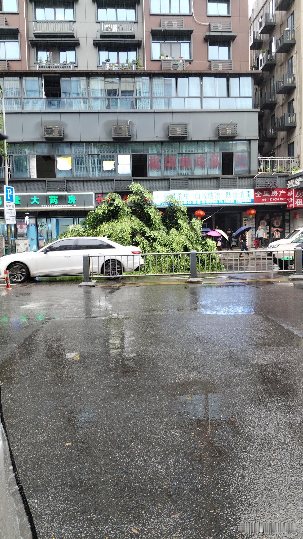 市和平东路一行道树倒在行车道中间,来往人及车辆请注意避让