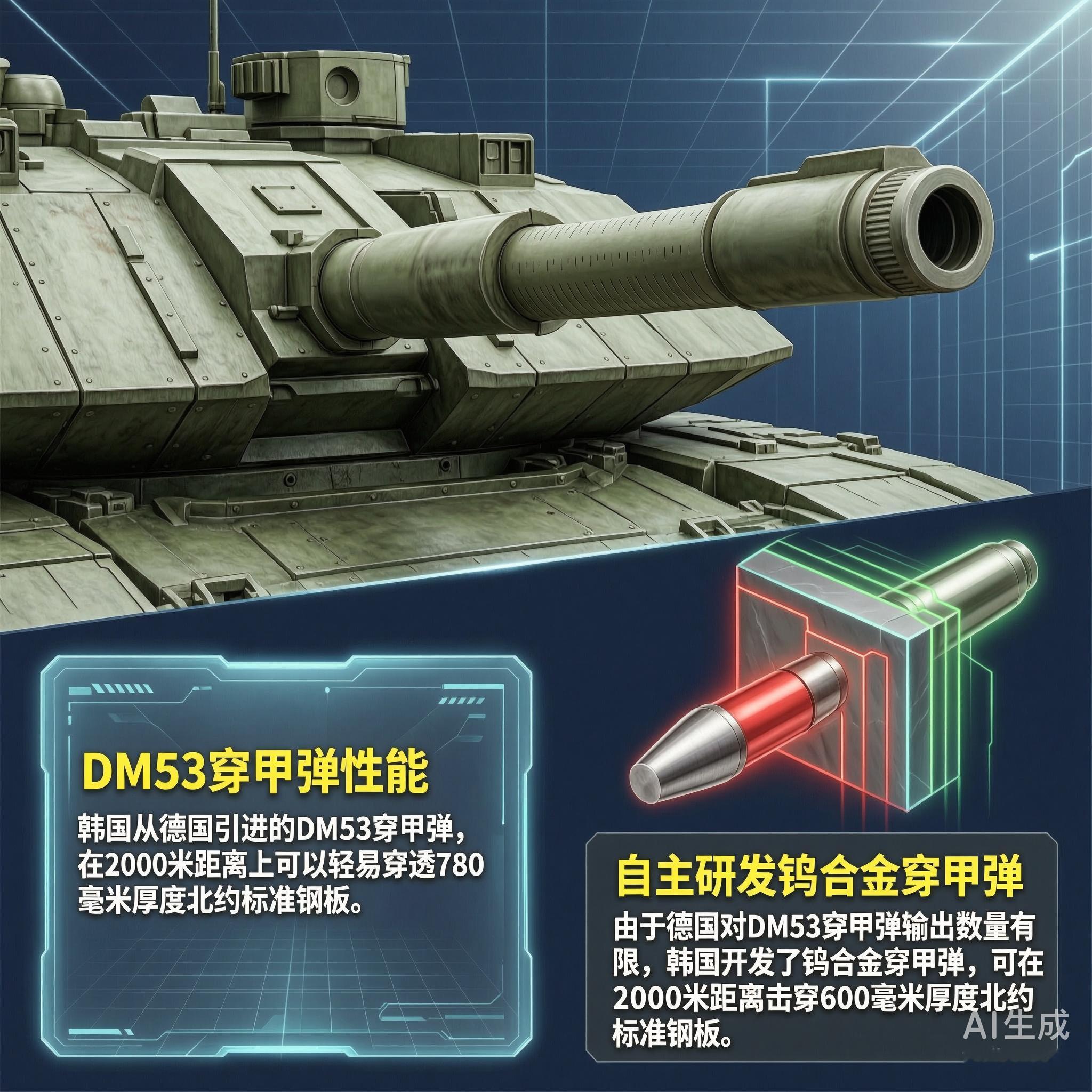 K2主战坦克配备的武器包括引进的德国120毫米L55滑膛炮,具有自动装填弹药和每分钟可以发射多达15发炮弹的能力。该炮可以在移动中发射,即使在地势崎岖的地方也不受影响。韩国同时从德国引进了一批DM53穿甲弹,使用DM53穿甲弹时在2000米距离上可以轻易穿透780毫米厚度北约标准钢板。由于德国对DM53穿甲弹输出韩国有数量限制,韩国还自己开发了一种钨合金穿甲弹,可在2000米距离击穿600毫米厚度北约标准钢板。