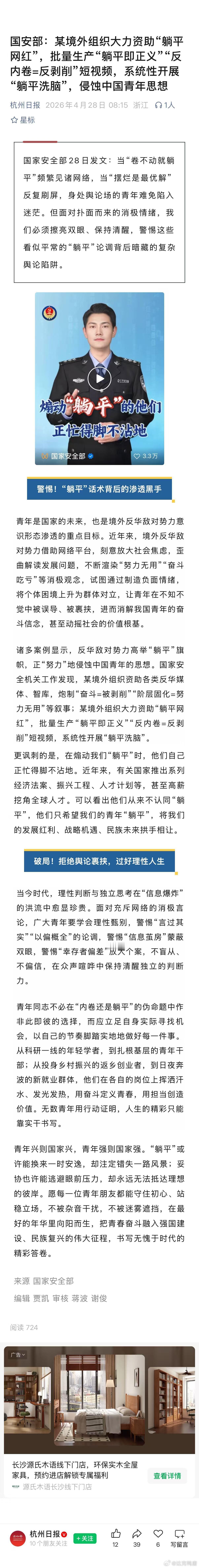 国家安全部28日发文:当“卷不动就躺平”频繁见诸网络,当“摆烂是最优解’反复刷屏