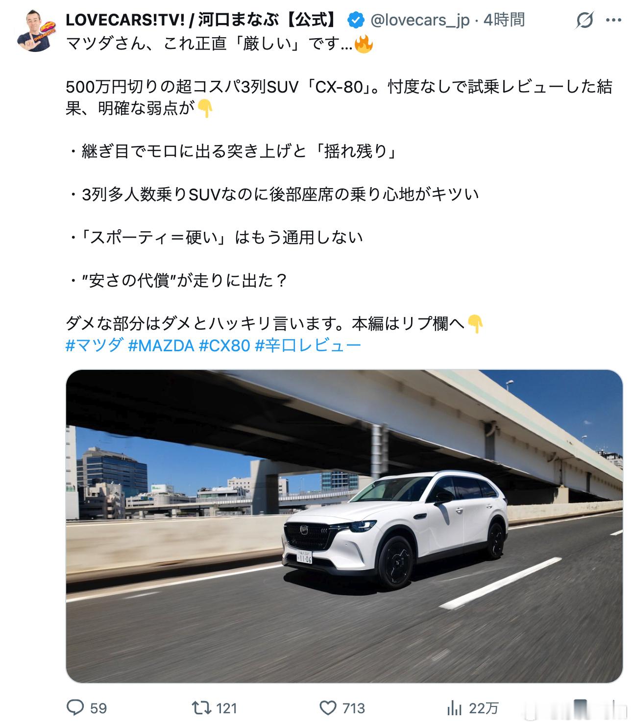 今天X上一个离奇的热搜,日本头部车评人河口学,在新款马自达CX-80的车评中,再次严厉批评CX-80的后排乘坐感受。作为一个三排座家用SUV,过路面接缝时的上冲感很强,还要摇晃几次才能平复。与此同时悬架还很硬。