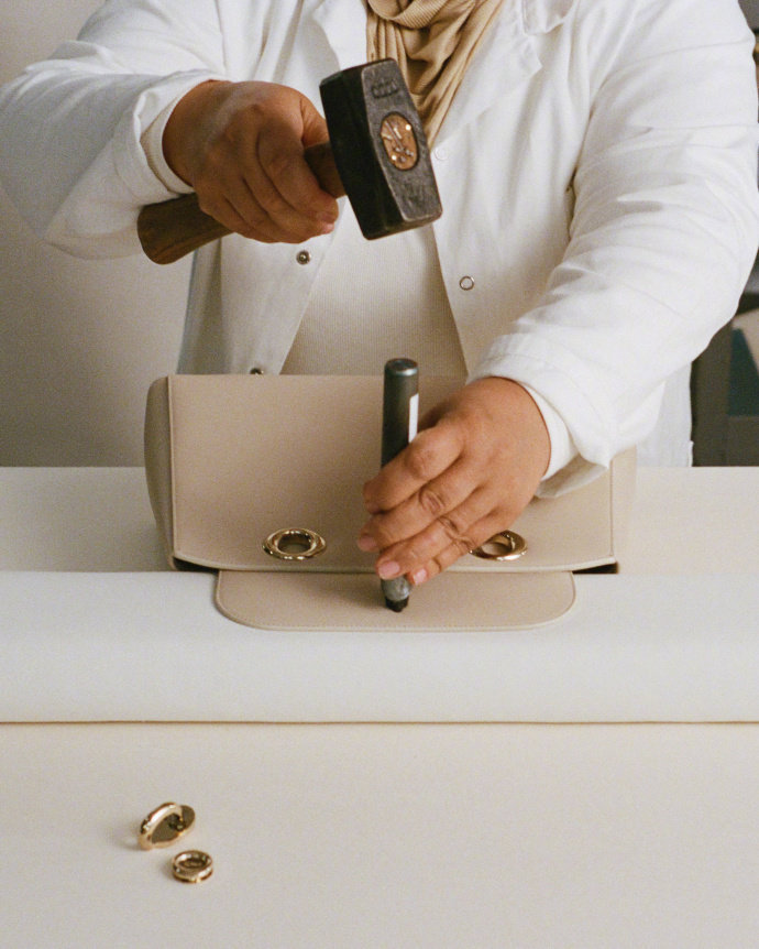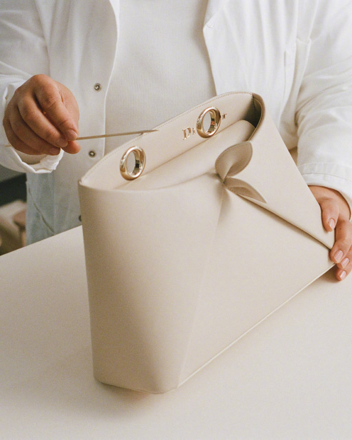 亮泽柔韧的小牛皮以立裁方式筑起包身,皮革翻折如折起一封信;蝴蝶结金属扣环,恰似信件的封印。设计师将整个时装史中他最钟爱的礼裙廓形,重新拆解为一支可随身携带的「立体俳句」,浪漫气息不言而喻~