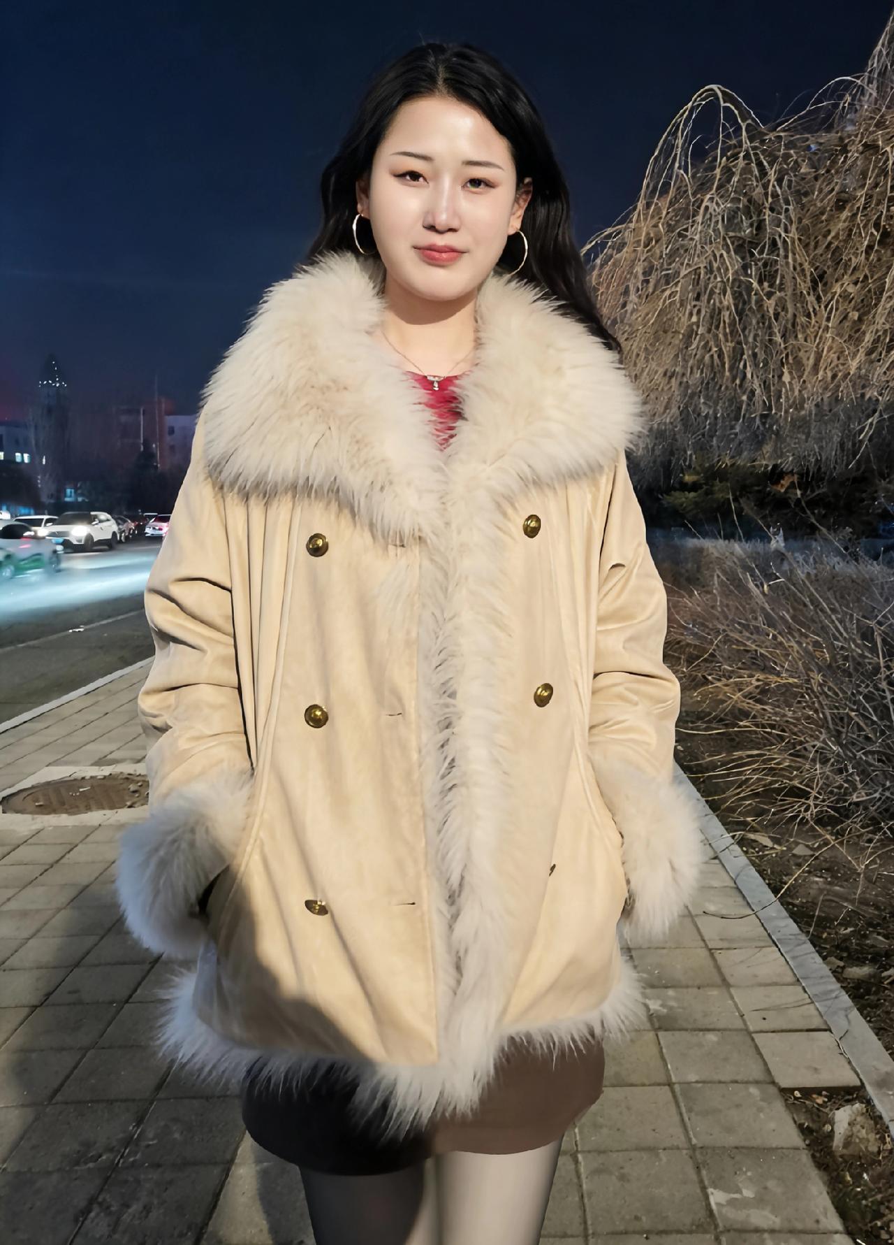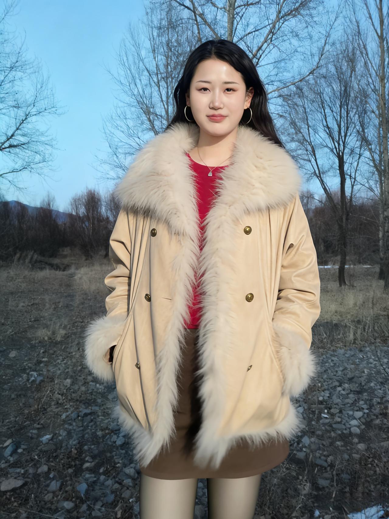 轻裘覆雪暖生香,狐领蓬松映日光。 笑立荒郊无俗态,一肩清艳胜春芳。