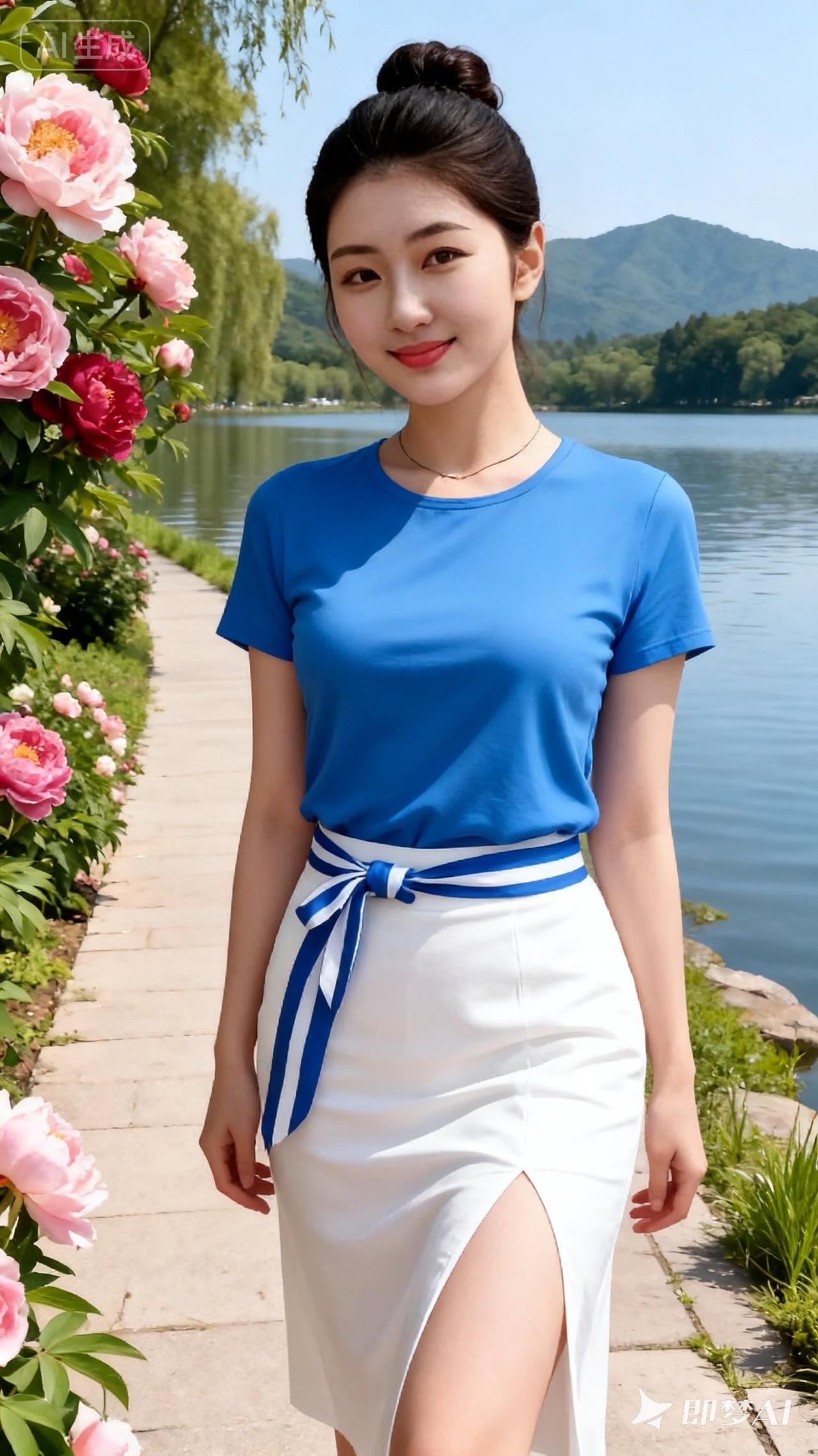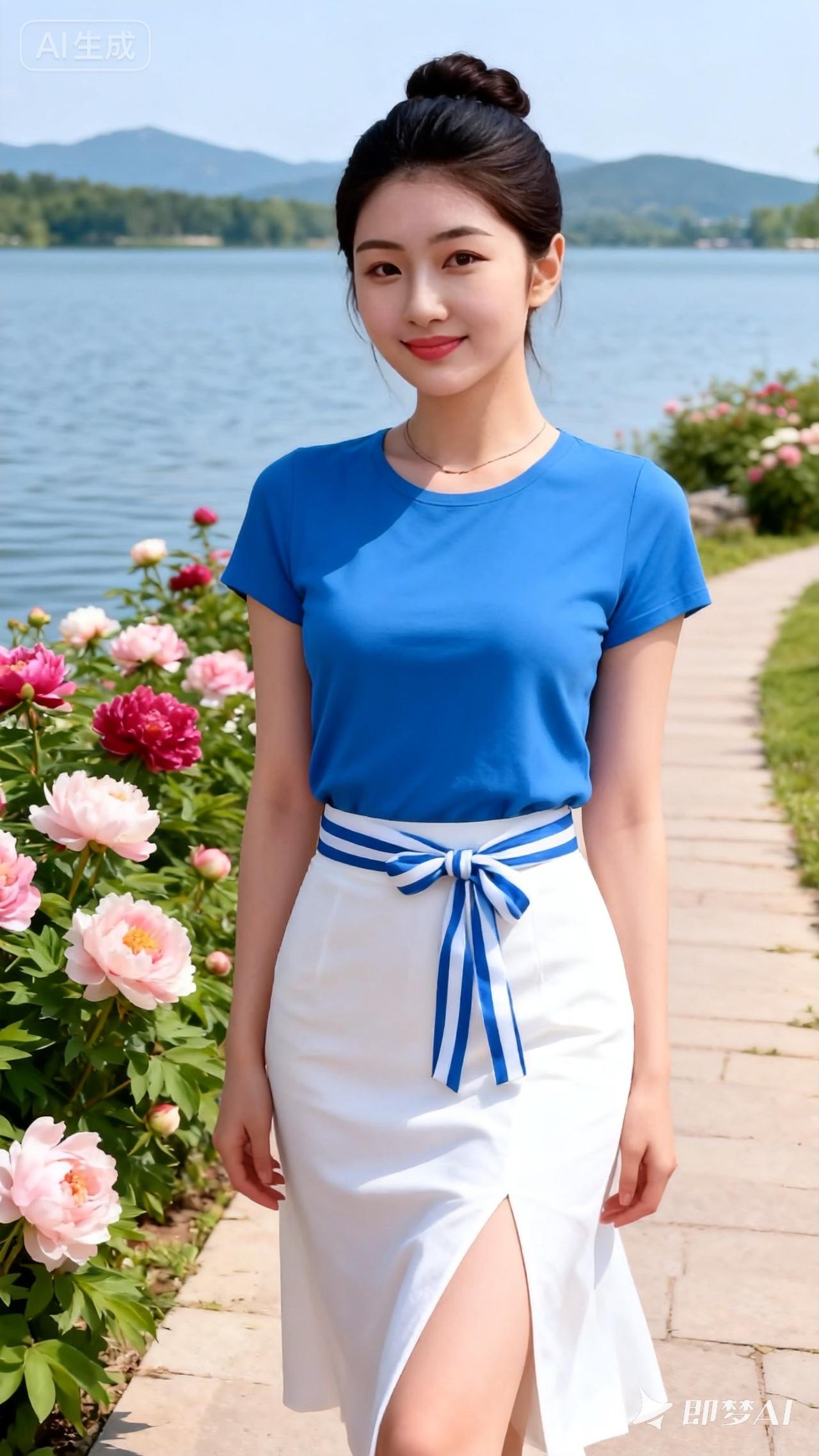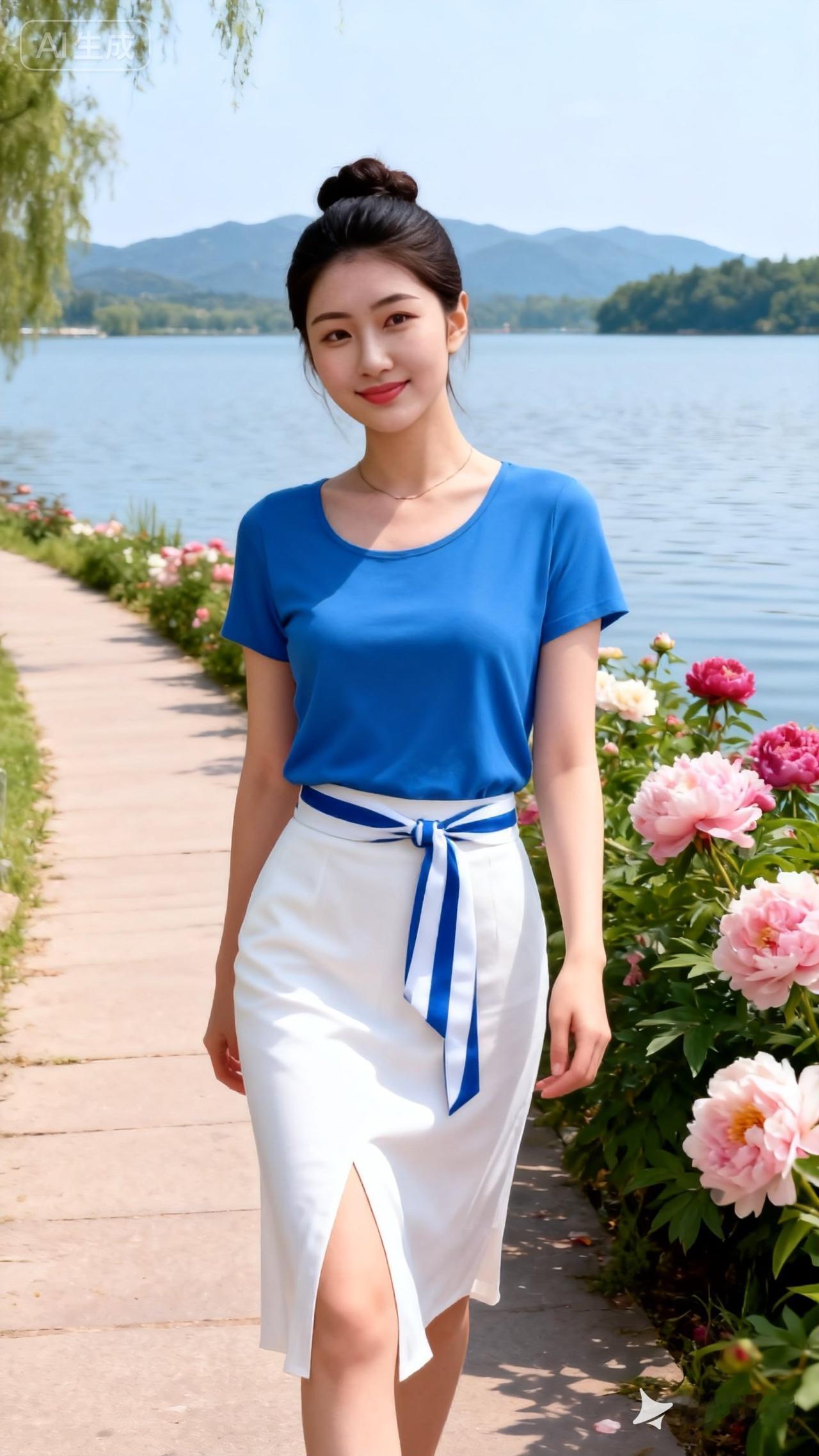 夏日清新穿搭,蓝白相间,漫步湖畔,尽享自然之美。
