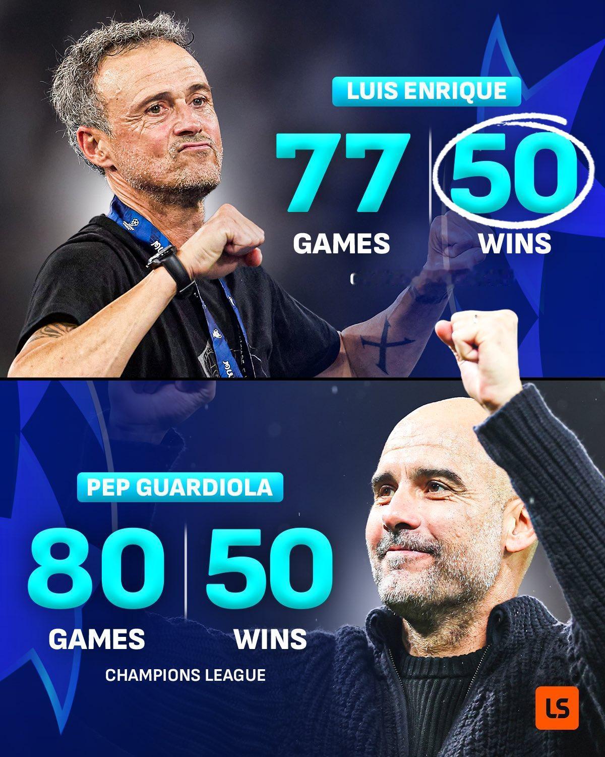 不仅仅是由于本场取胜后,恩里克打破了一项欧冠执教记录,他在更少的比赛场次77场比赛取得了50胜,瓜迪奥拉的记录是80场。