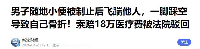 男子街头随地小便遭劝阻,当场飞踹对方,结果一脚踩空摔成粉碎性骨折,事后竟起诉索赔18万