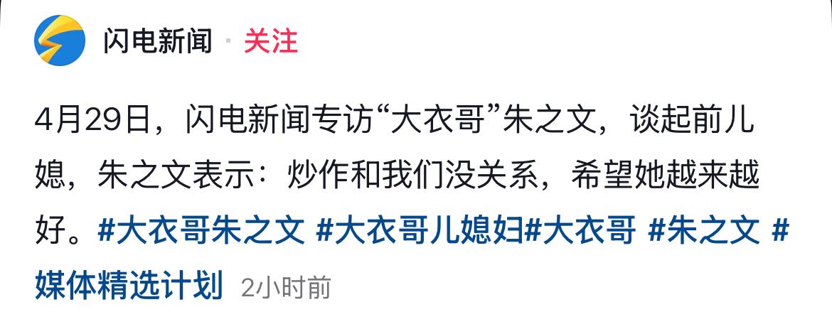 其实,大衣哥完全可以怒怼前儿媳,因为这样,他的流量就会越来越高,但大衣哥不是这样的人,反而是祝福前儿媳。