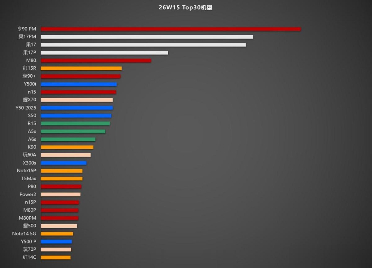 2026年W15的单机销量榜依然精彩,华为8款机型排名前30,机型数据排名第一。其中畅享90ProMax蝉联冠军,Mate80排名第五,畅享90Plus排名第七,nova15排名第九,Pura80排名第21,nova15Pro、Mate80Pro、Mate80ProMax排名23-25。