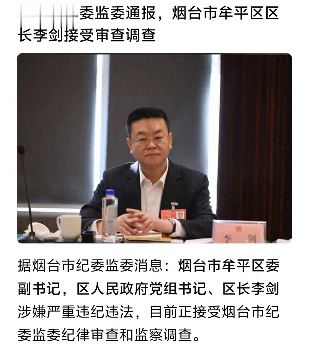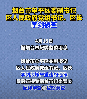 牟平区区长李剑涉嫌严重违法违纪被查,这是这么多年反腐斗争以来牟平第一个被查的区长,反腐的春风终于吹到了牟平,而且一下子就是区长被查,这对于牟平来说是一个好消息,因为牟平的目标是“重返第一方阵”,而腐败分子就是牟平发展前进的最大的绊脚石,只有把这些贪腐分子清理干净,至少让他们不敢明目张胆,牟平才能更好的谈未来、谈发展!