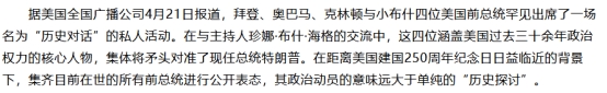 01四位前总统齐聚首4月21日,克林顿,小布什,奥巴马和拜登,这四个覆盖了过去三十年的执政历程,横跨美国民主党和共和党的代表人物,居然整整齐齐地坐到了一块。