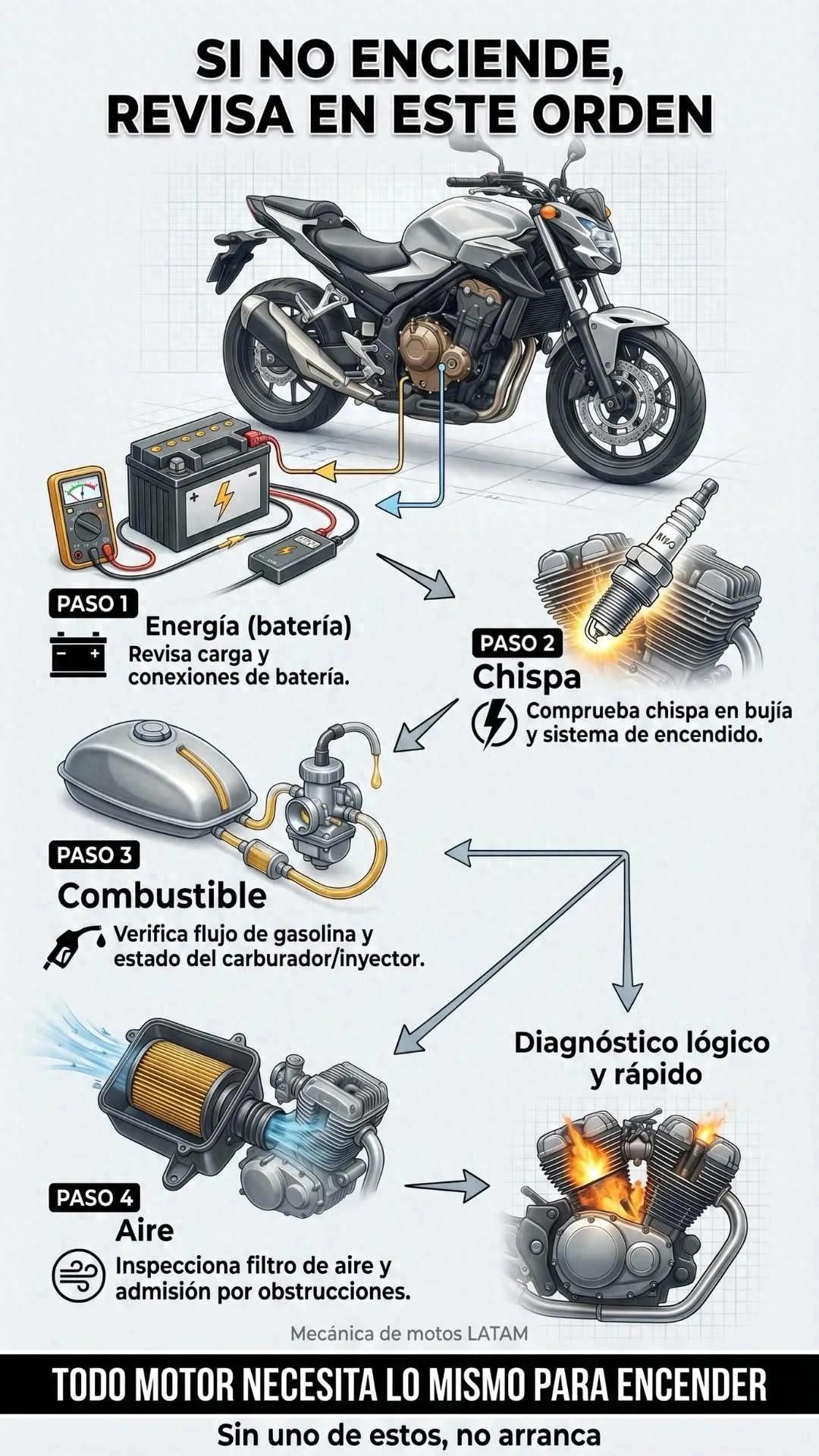 摩托车启动的核心要素始终一致:电能 + 火花 + 燃油 + 空气。多数人随机检查浪费精力,遵循以下逻辑顺序可快速锁定故障。
