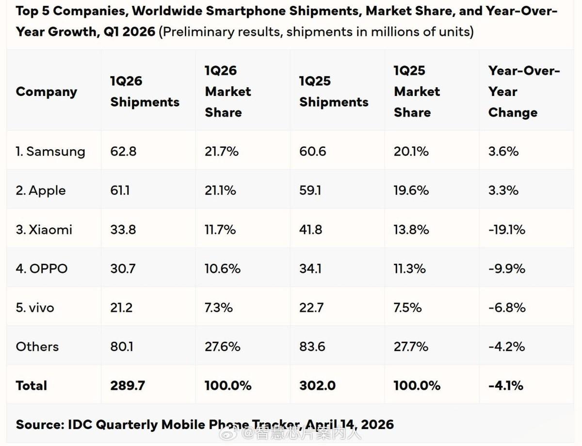 全球市场方面,2026年第一季度出货量排名前五的厂家为三星、苹果、小米、OPPO和vivo。三星和苹果的出货量增长都在3%以上,3大国产品牌的出货量均出现下滑,其中最大的输家依然是小米,出货量从2025年Q1的4180万台下降到2026年Q1的3380万台,足足降低了800万台,跌幅高达19.1%,远超OV。