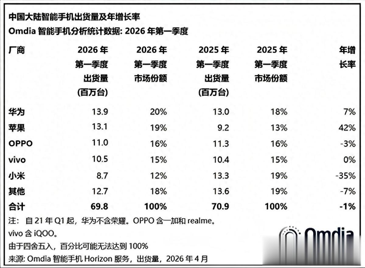 2026年第一季度,国内手机市场最大的赢家是华为和苹果!在大盘下跌的背景下,华为手机出货量增长了7%,以1390万的出货量稳居国内市场第一,市场份额高达20%。苹果手机出货量则是大涨42%,以1310万的出货量排名第二,市场份额为19%。第一季度国内手机市场最大的输家无疑是小米,出货量同比暴跌35%,从1330万台跌至870万台,少了整整460万台,市场份额仅为12%。