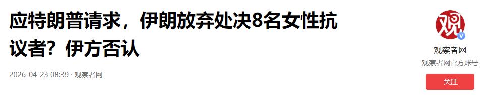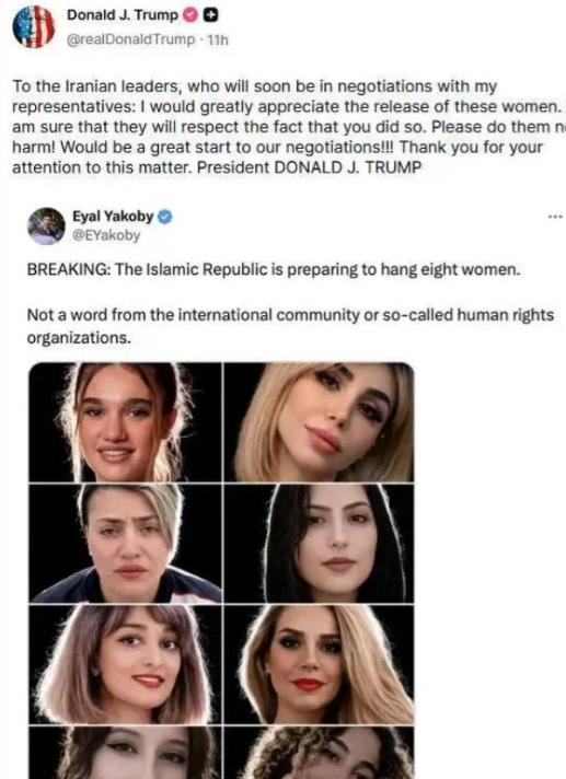 可美国这边也没闲着,停火之后没想着好好谈,反而搞起了别的动作。4月22号,特朗普突然转发英国一个伊朗人权组织的消息,说伊朗要处决八位反政府抗议的女性,紧接着就公开喊话伊朗领导人,说希望能放过这8个人,不要伤害她们,还说这么做能给美伊谈判开个好头。这事看着像是特朗普心软了,关心女性人权,其实根本不是那么回事,完全是他打的一张政治牌。
