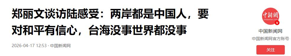 中国新闻网:郑丽文谈访陆感受:两岸都是中国人,要对和平有信心,台海没事世界都没事