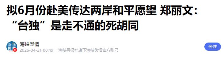 海峡舆情:拟6月份赴美传达两岸和平愿望 郑丽文:“台独”是走不通的死胡同