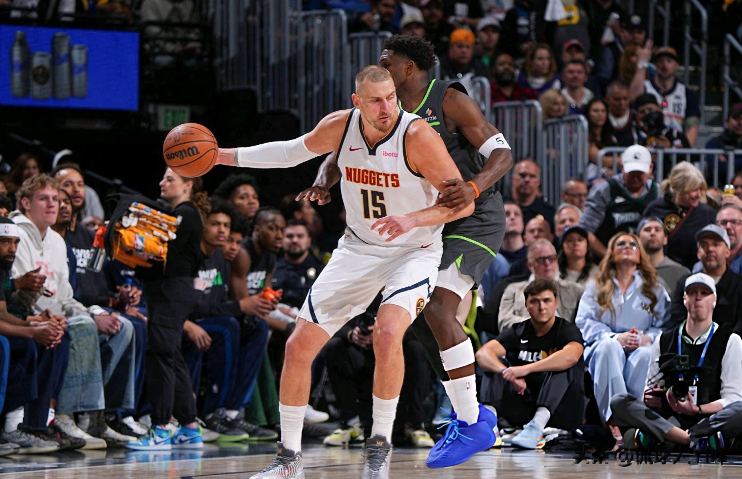 开局运筹帷幄,串联全队稳住阵脚比赛伊始,森林狼便展现出极强的侵略性,迪文琴佐连中三分,麦克丹尼尔斯单节轰下10分,首节便以33-23领先掘金10分,内线戈贝尔与兰德尔的双塔组合,给掘金禁区造成巨大压力。此时的约基奇并未急于个人进攻,而是化身球队“大脑”,用精准的传球撕裂对手防线。首节他仅出手2次,拿到3分,但抢下5个篮板,送出4次助攻,多次为穆雷、戈登创造轻松得分机会,用组织串联稳住球队节奏,避免分差被进一步拉大。
