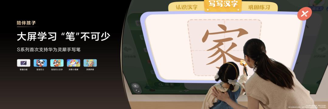 如今,随着孩子接触电子设备的年龄越来越早,如何在趣味学习中守护用眼健康,成为家长普遍关心的问题。华为智慧屏 S7 Pro首次上线“儿童教育”专区 ,内置纪录片、启蒙动画、互动绘本与益智游戏等内容,聚合洪恩识字、儿歌多多等80+款优质第三方应用 ,覆盖3至12岁不同阶段的学习需求。搭配华为灵犀手写笔,孩子可在大屏上完成拼音跟读、汉字书写与创意绘画等互动学习,轻松实现边玩边学。