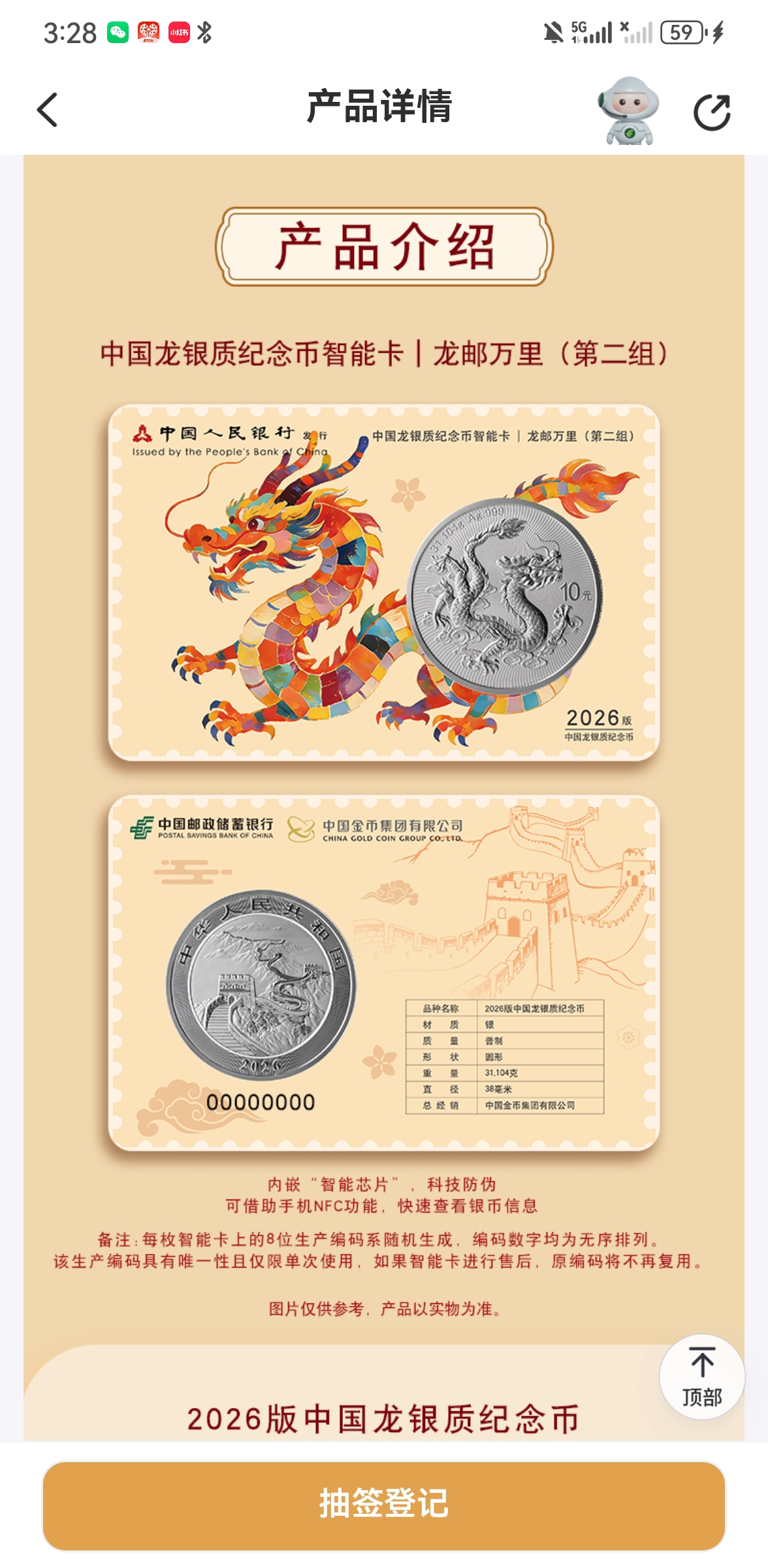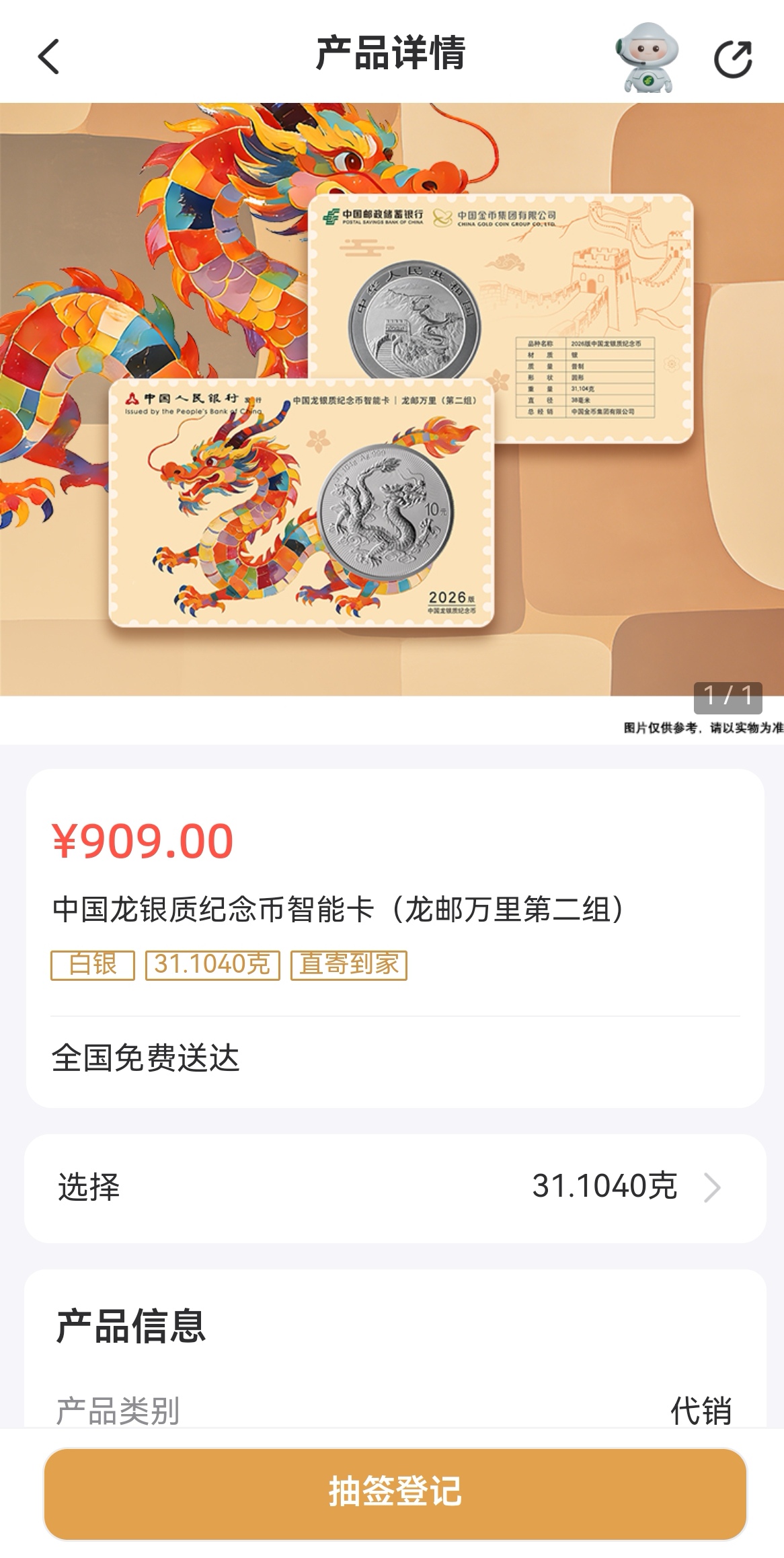 2026版中国龙银币装帧卡:909元