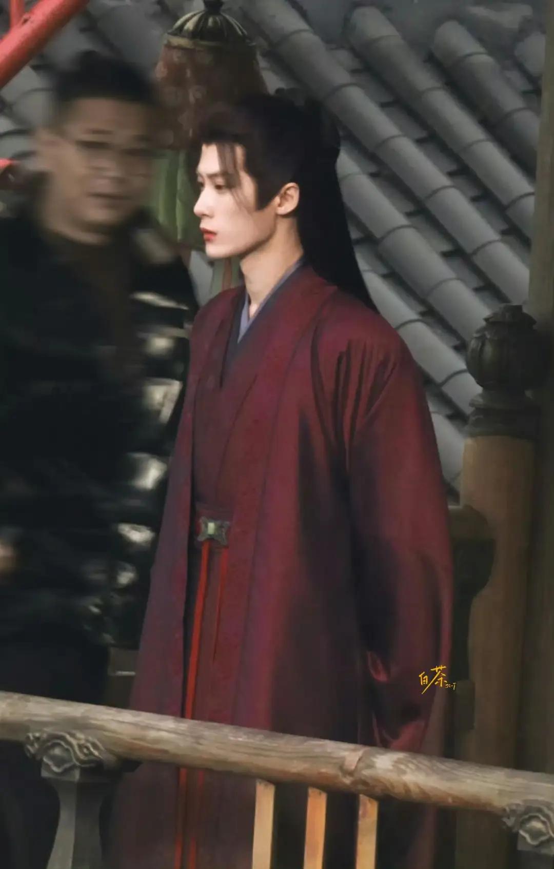 还有这套暗红色的妆造,当时一出来那股清冷感扑面而来:朱红染衣,墨发垂肩。凭栏而立视,他是这古楼里最沉默的诗,字里行间都是山河与故人。