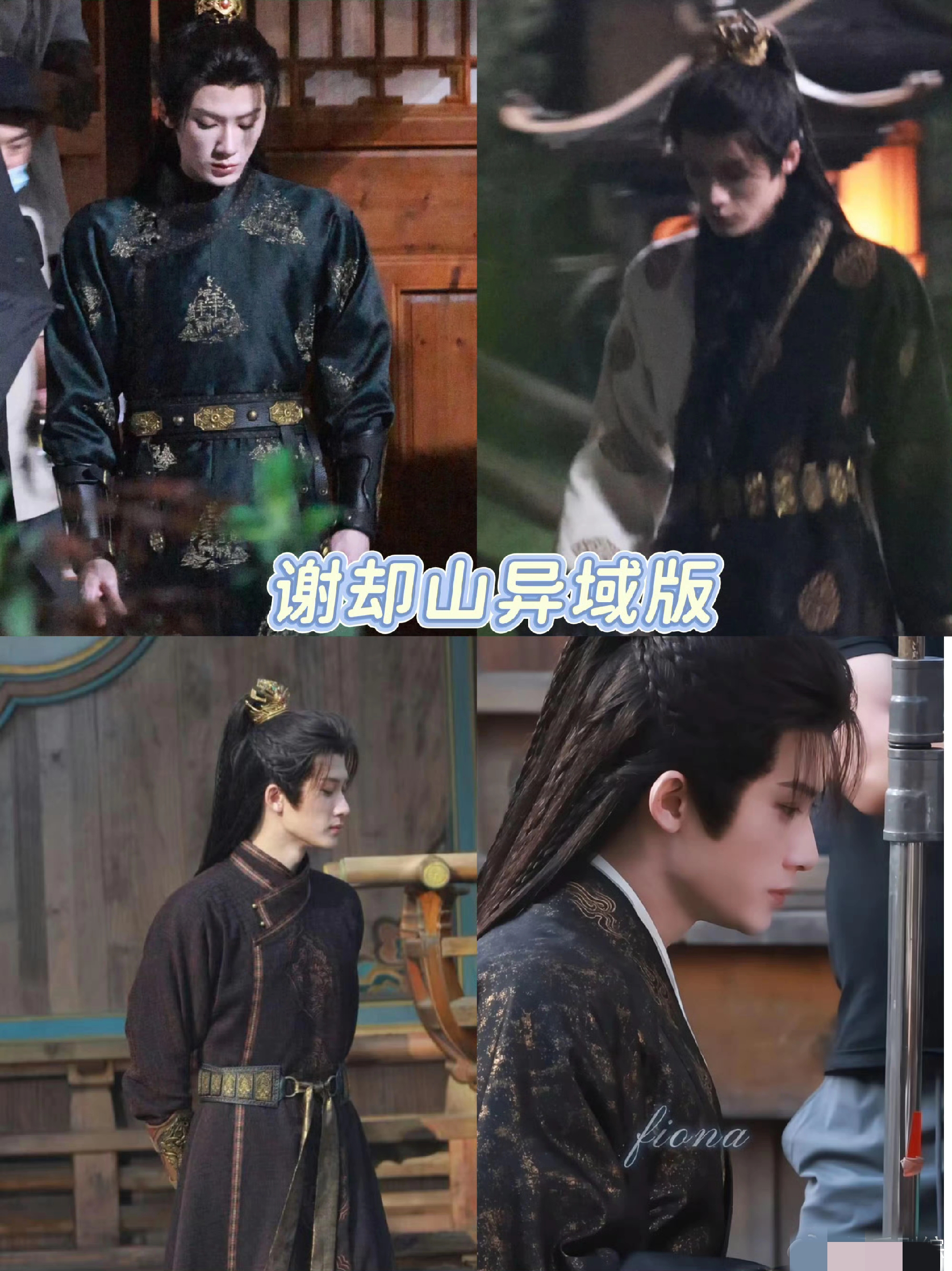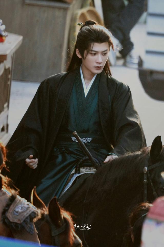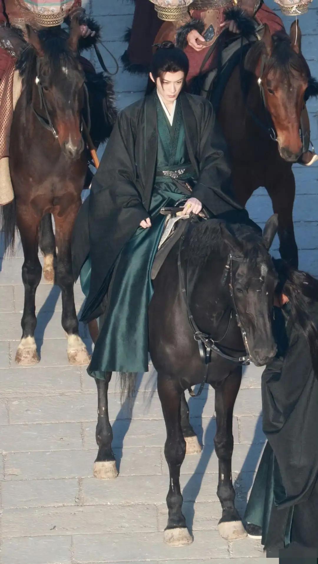 还有我收藏了很久的这套墨绿色妆造,马背上的谢却山墨绿内搭叠着玄色广袖外袍,衣料在光影下泛着温润质感,这件墨翠色的袍子配上谢却山墨黑的发,竟然显得并不沉闷, 反而点缀得恰到好处!