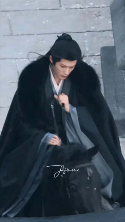 身穿黑色大氅单手飞身上马的谢却山,衣袂翻飞,动作轻盈丝滑,这般眉眼载风月、身姿藏锋芒的少年郎,任谁看了都要乱了心跳、移不开目光!