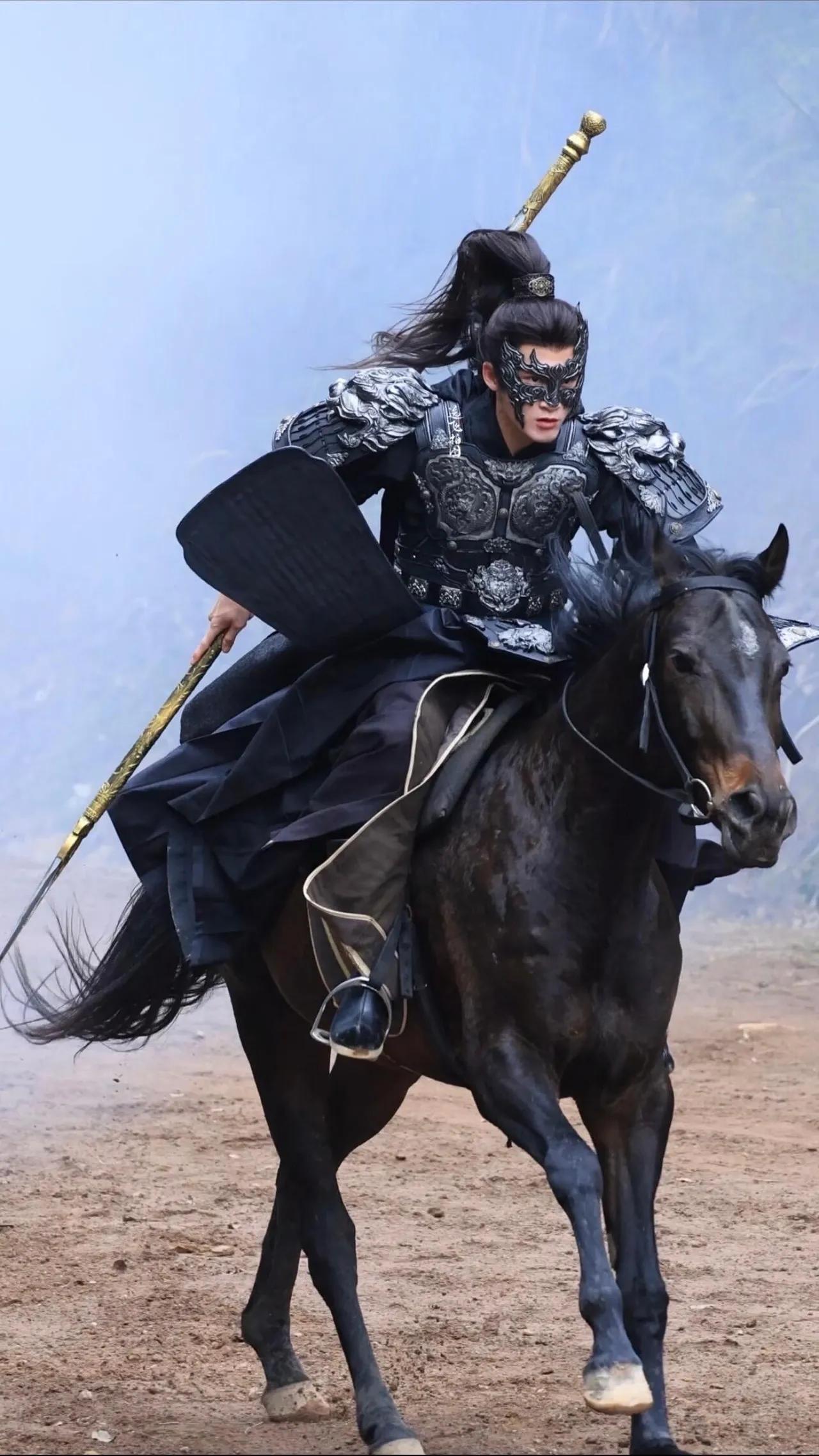 最后隆重出场的是我们的军师大人!谢却山手持长枪端坐在马背上,他身穿黑银铠甲高马尾束起所有锐气,雕花面具下难掩肃杀矜贵!