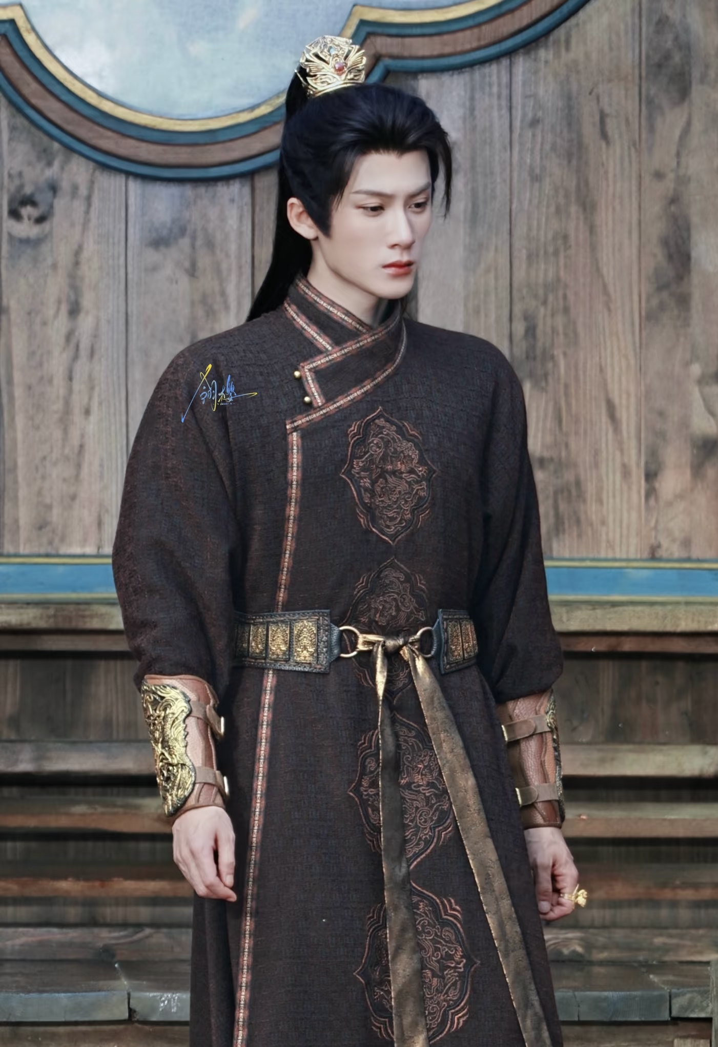 四月十八日的路透:这套造型紫金束腰长袍 ,金冠高马尾,衣襟口设计很有游牧民族特色, 这一看就感觉像大歧的!