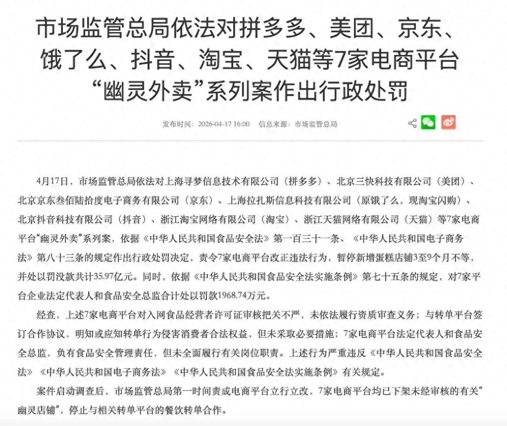 4月17日,国家市场监督管理总局抛出重磅炸弹:对美团、饿了么、拼多多等7家头部平台开出总计35.97亿元巨额罚单,这是自2015年食品安全法修订以来,监管部门对平台开出的最大金额罚单,直接震动整个外卖与电商行业,更关系到全国4.5亿外卖用户的餐桌安全。