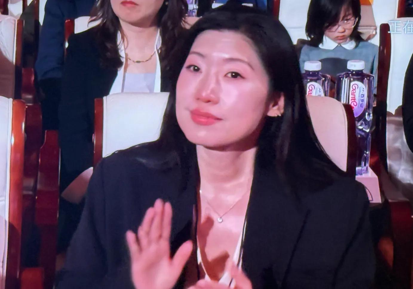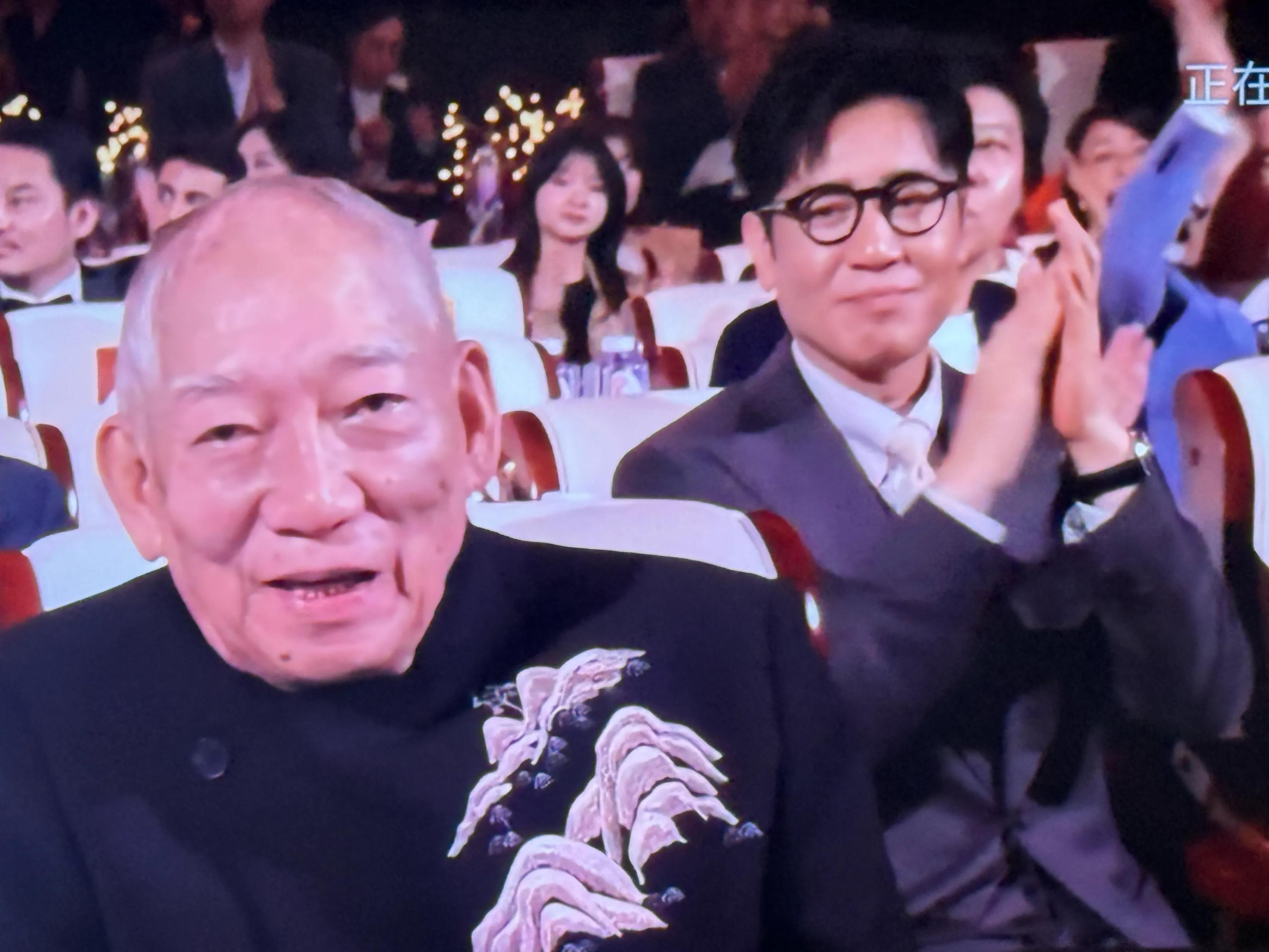 张艺谋与袁和平坐在一排,他最先站起来对老人致敬,吴京咧着嘴,笑得像个孩子,眼眶却有点泛红,坐在袁和平后排的于和伟,戴着黑框眼镜,能看出他眼含泪花。