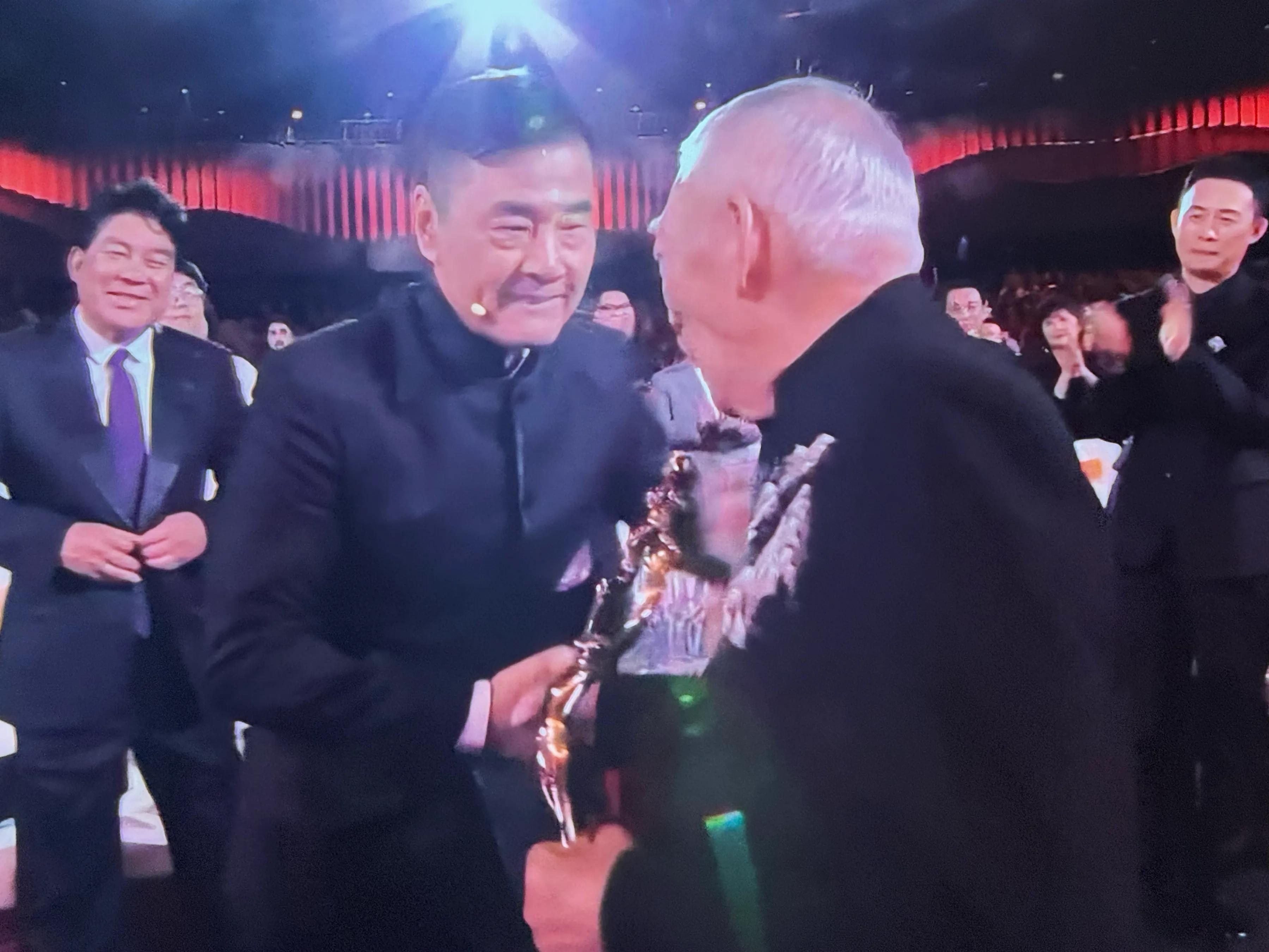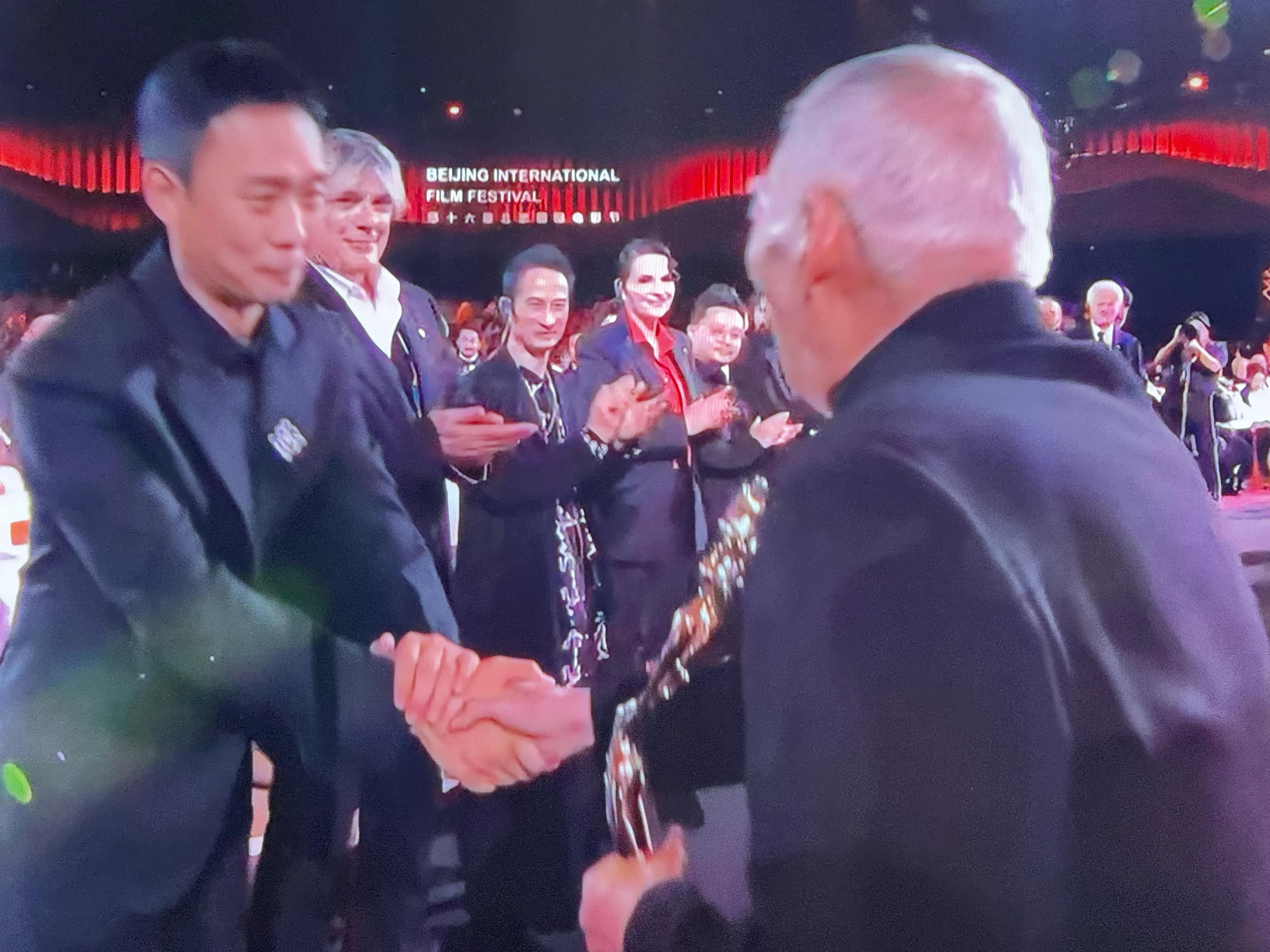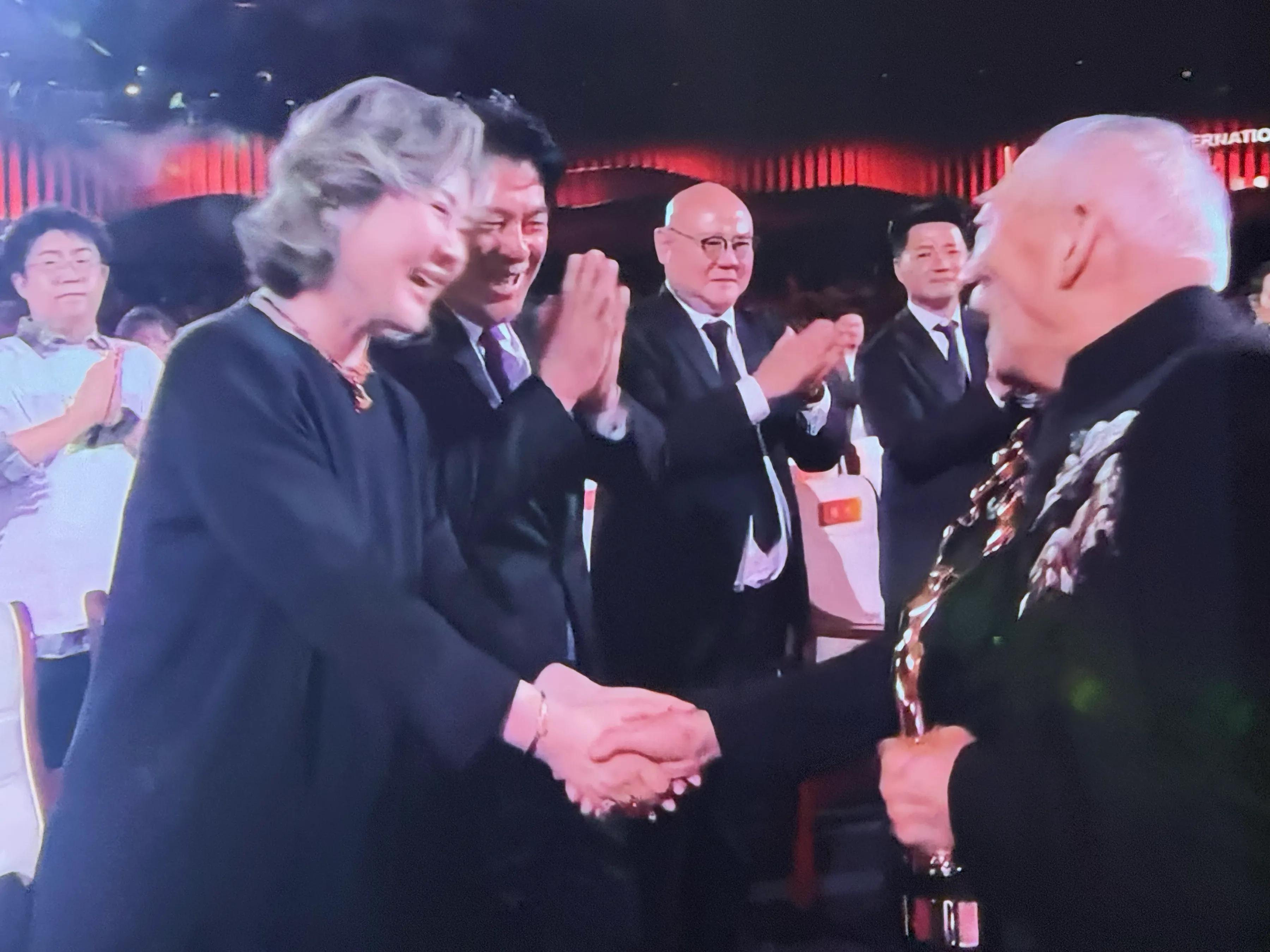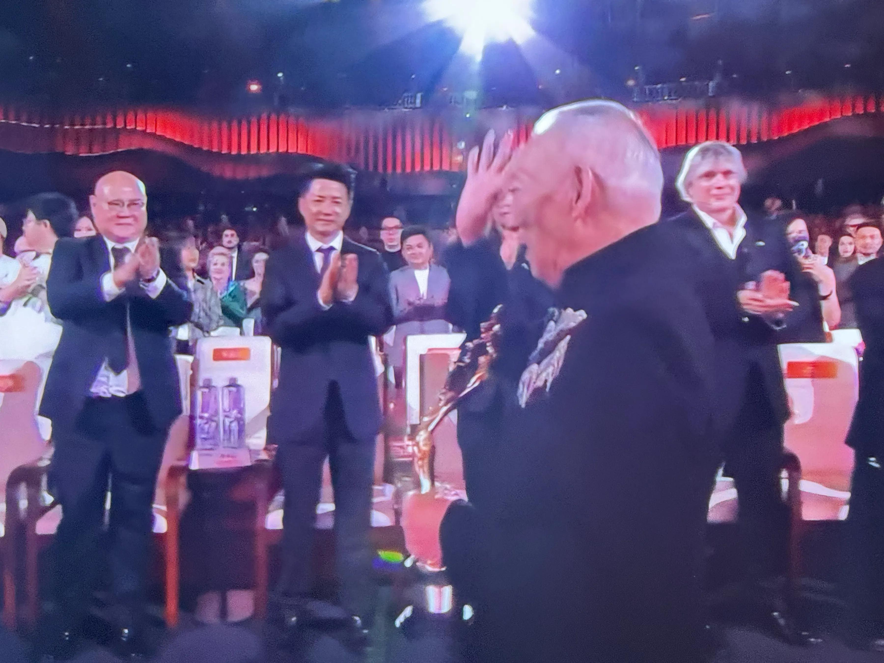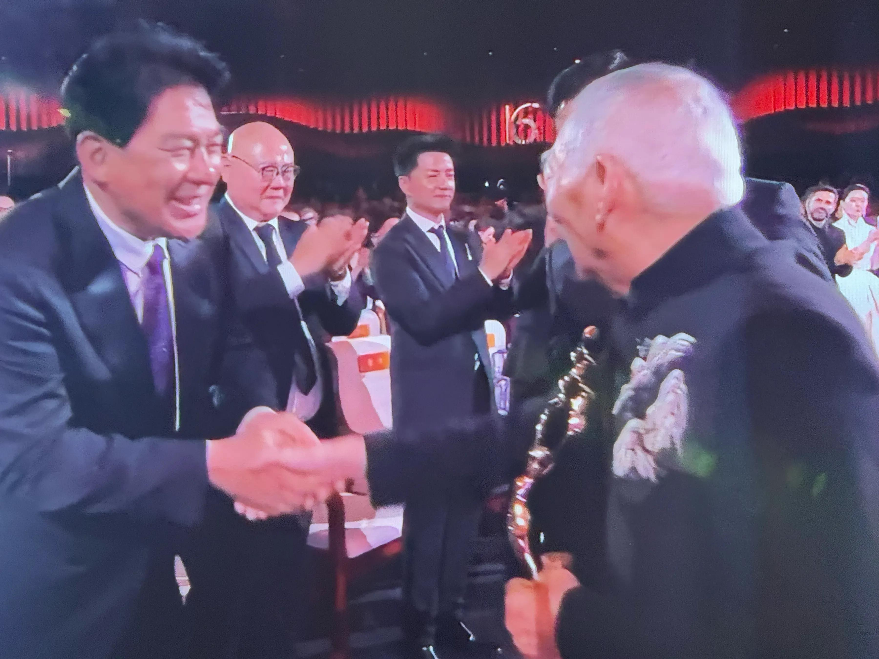 接着,张译、朱时茂、丛珊、段奕宏、袁华、于和伟、张艺谋、于荣光、吴京站起来与袁和平握手,张译弯腰鞠躬表达敬意!