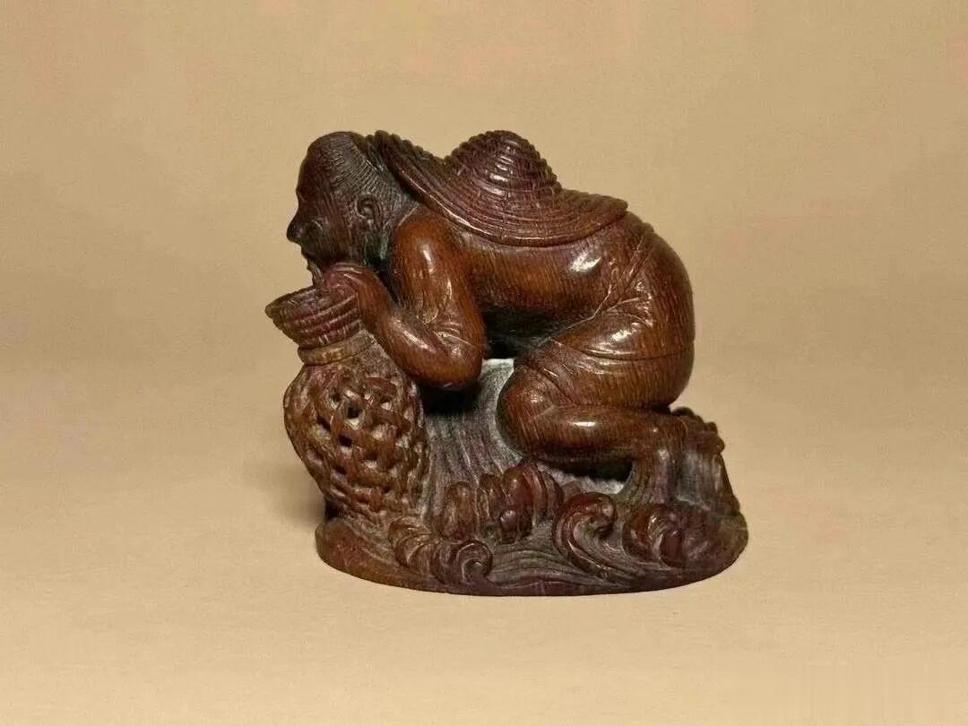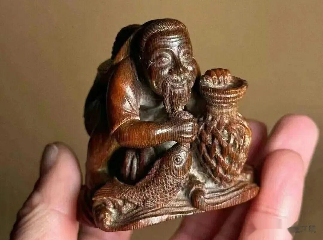 这是一件圆雕工艺的角雕,属于文房案头把玩件。造型大家一看就明白,是耳熟人详的渔翁得利。难得的是雕工,老翁表情依然,一手搭鱼篓,一手抓条大鱼。底部还能看到一些波浪,整个场景非常鲜活,有生活气息。