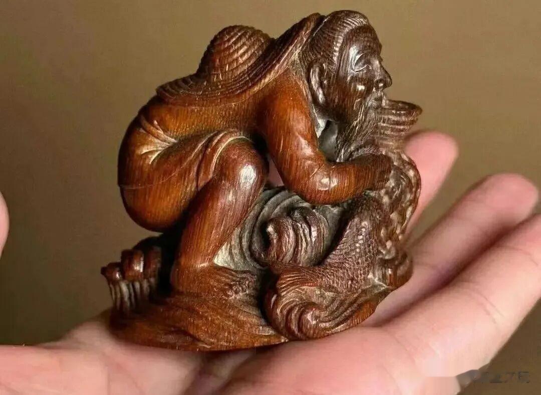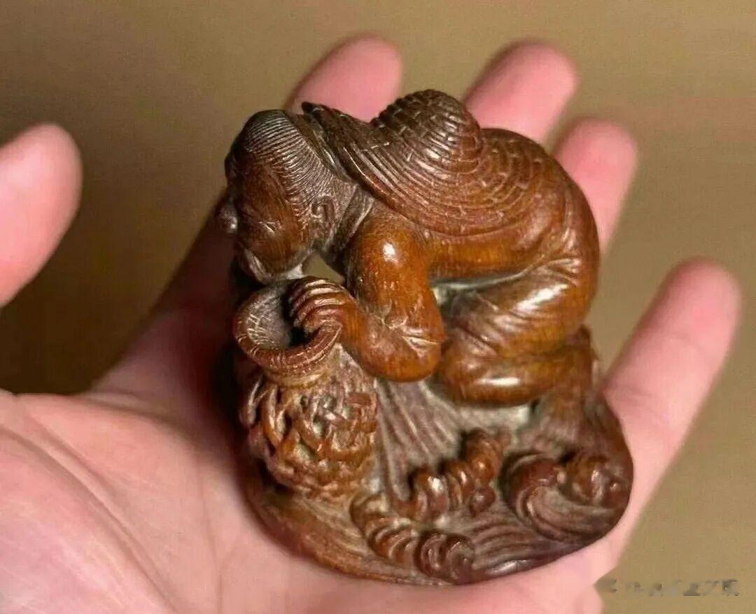 分享一款本人收藏的老犀角雕——渔翁。这是一件圆雕工艺的角雕,属于文房案头把玩件。造型大家一看就明白,是耳熟人详的渔翁得利