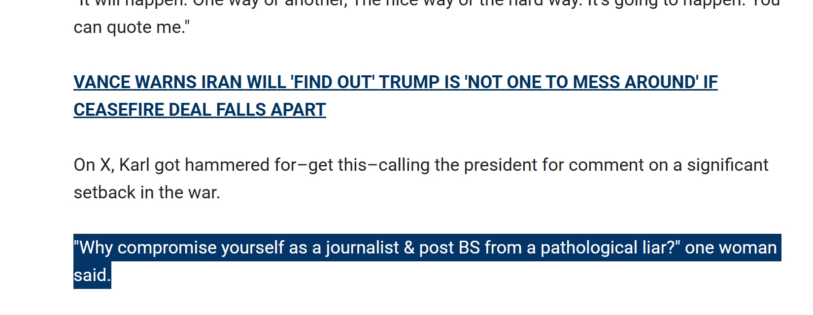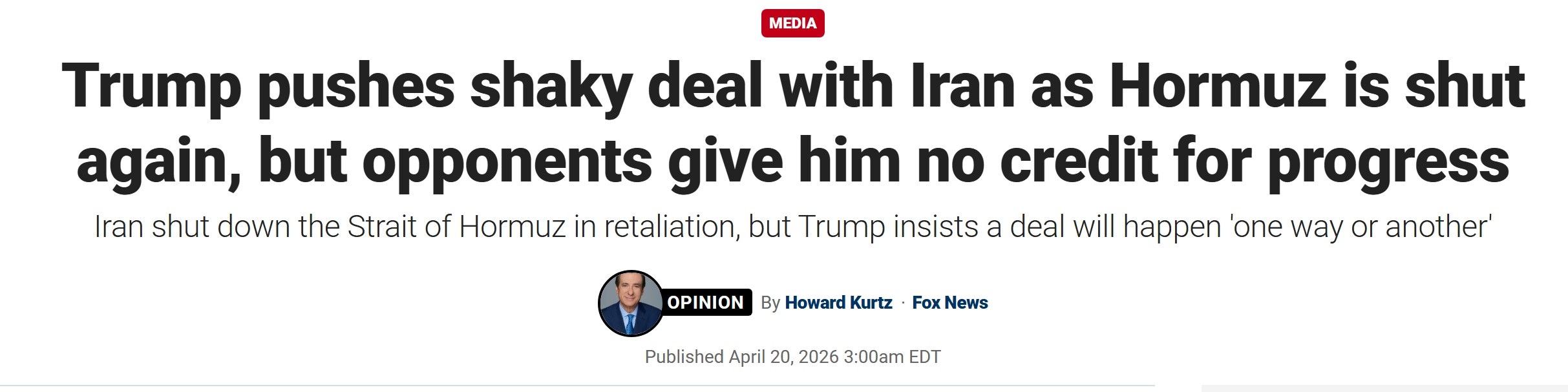 顺便说一句,福克斯新闻的这篇文章最后是这么说的:假设停火得以维持,霍尔木兹海峡重新开放,并最终达成和平协议,民主党人和主流媒体,是否会哪怕勉强承认唐纳德·特朗普完成了一件具有历史意义的事情?对此,我并不确定。