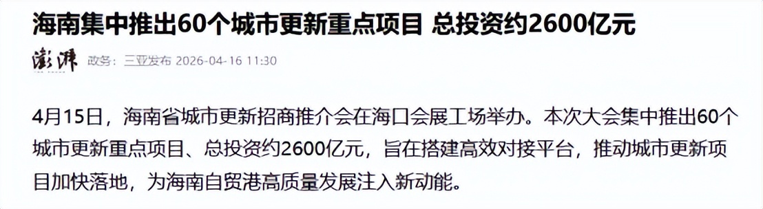 为了这个目标,海南在2026年4月15日专门开了一场招商会,一次就拿出了60个重点项目,总投资规模将近2600亿元。