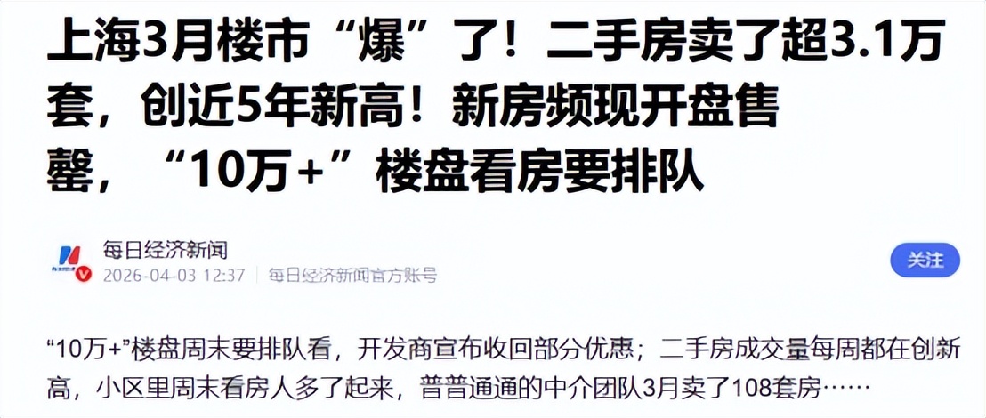 2026年3月,上海的二手房成交量超过了3.1万套,创下了近五年来的单月最高纪录,房价也结束了连续33个月的下跌。