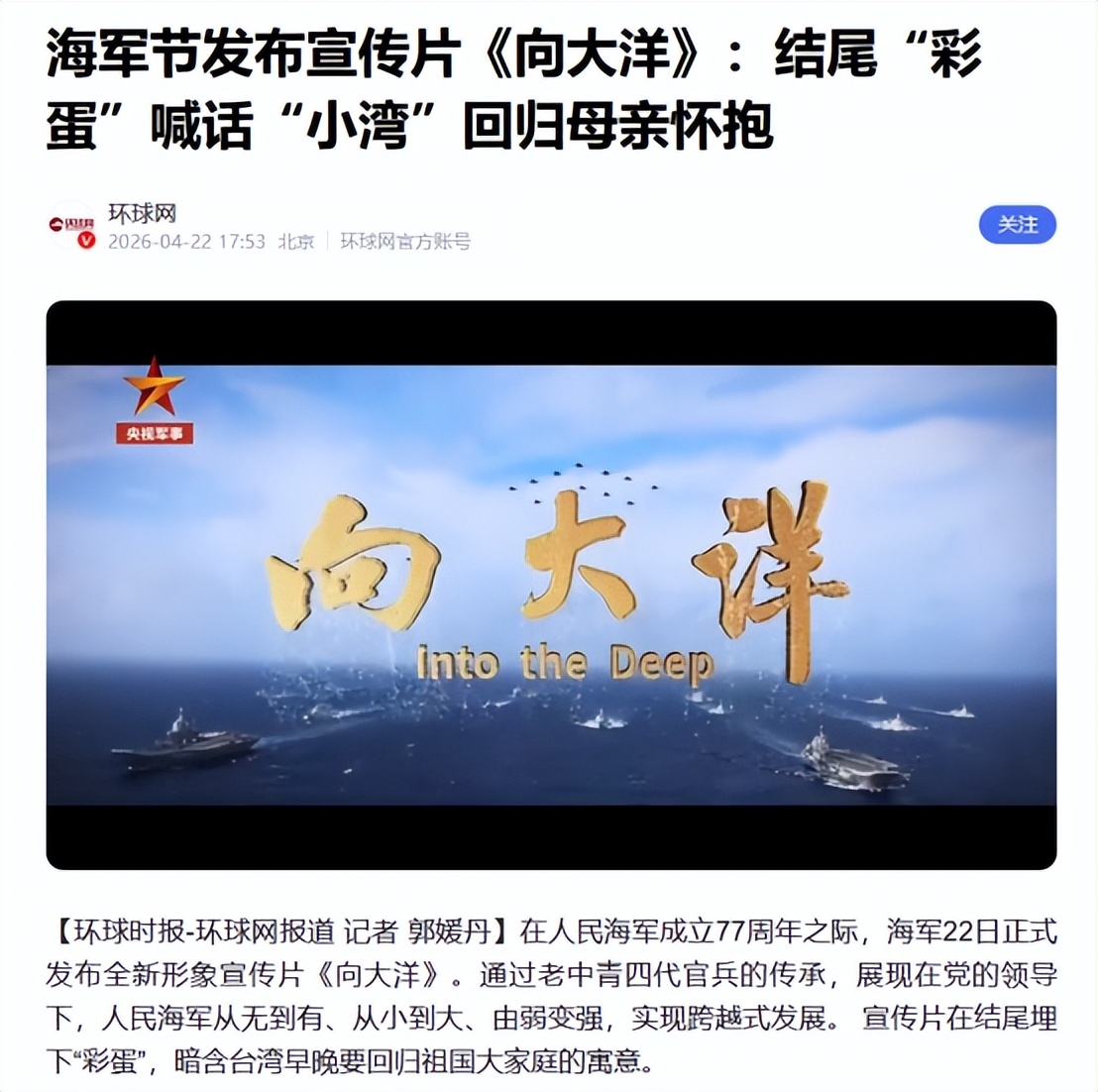 01宣传片暗藏秘密4月22日,人民海军成立77周年的节点上,官方发布了一条宣传片,这条片子名叫《向大洋》,总共七分多钟,里面信息量很大。