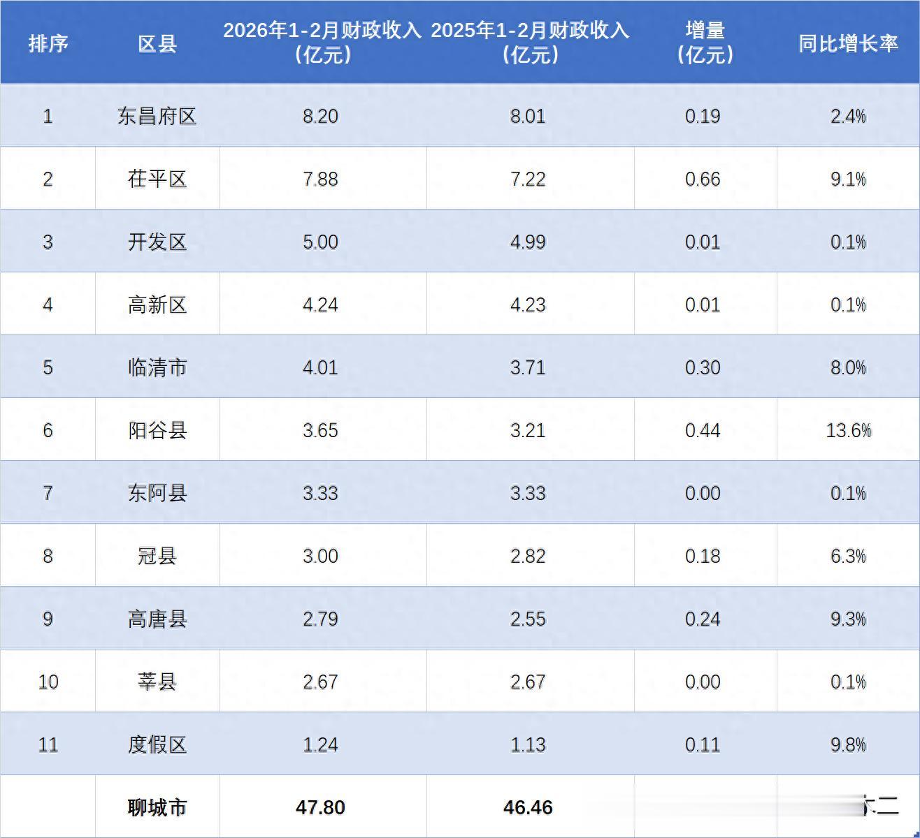 2026年1-2月地方财政收入超过三亿的还有三地,分别是阳谷县、东阿县和冠县,累计金额分别为3.65亿元、3.33亿元和3.00亿元。三地之中,阳谷不仅总量最高,其增速13.6%也在后面两地之上,更是全市最高,表现足称最佳!而东阿县增速0.1%不仅不及阳谷、也在冠县之下,表现实属一般,未来还需尽快发力才是。