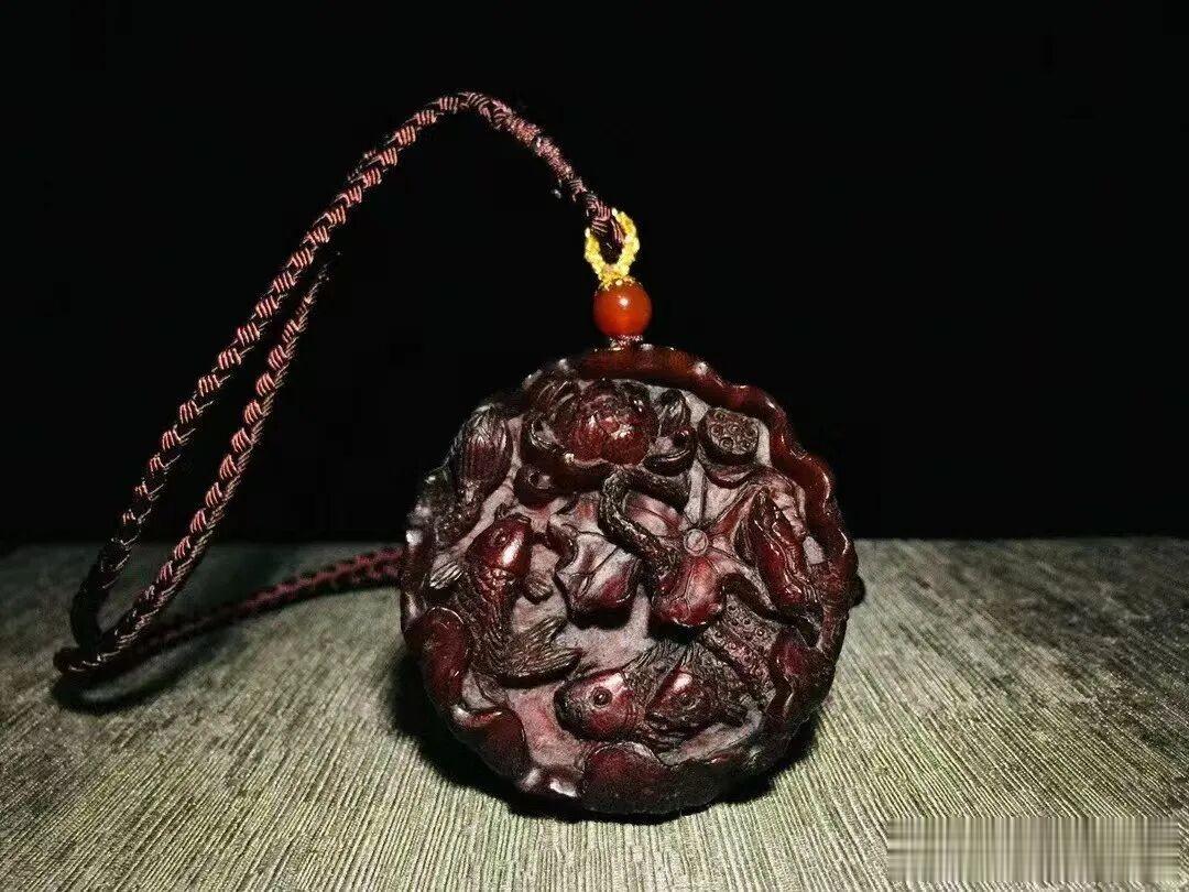 欣赏一款收藏多年的老犀角雕牌子,题材是连年有余。角质颜色偏向于暗红色。