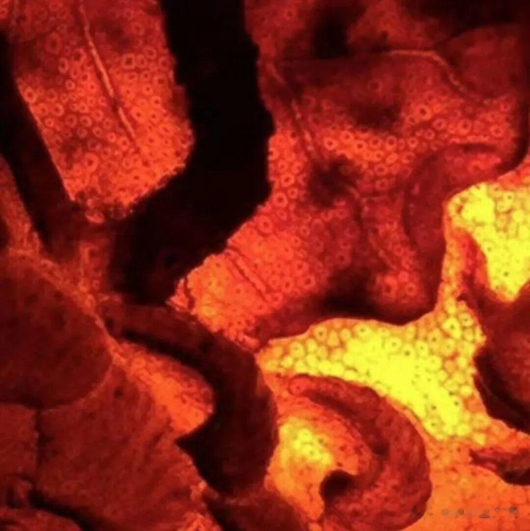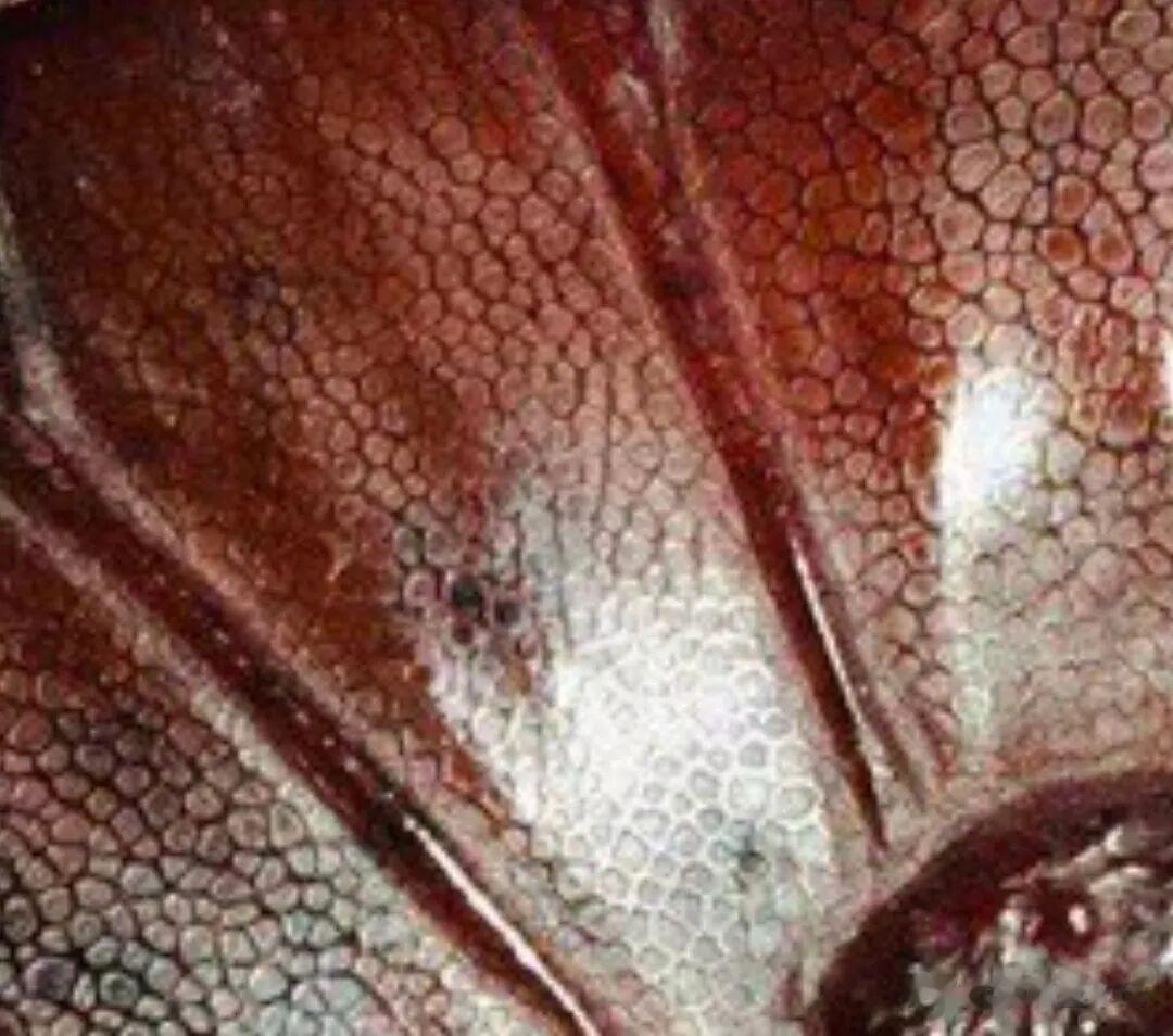 放大30倍近距离感受一下这牌子的纹理特征。我们能看到颗颗紧挨着的鱼籽纹理,这种自然形成的奇特微景观不是现在仿造能模仿出来的。